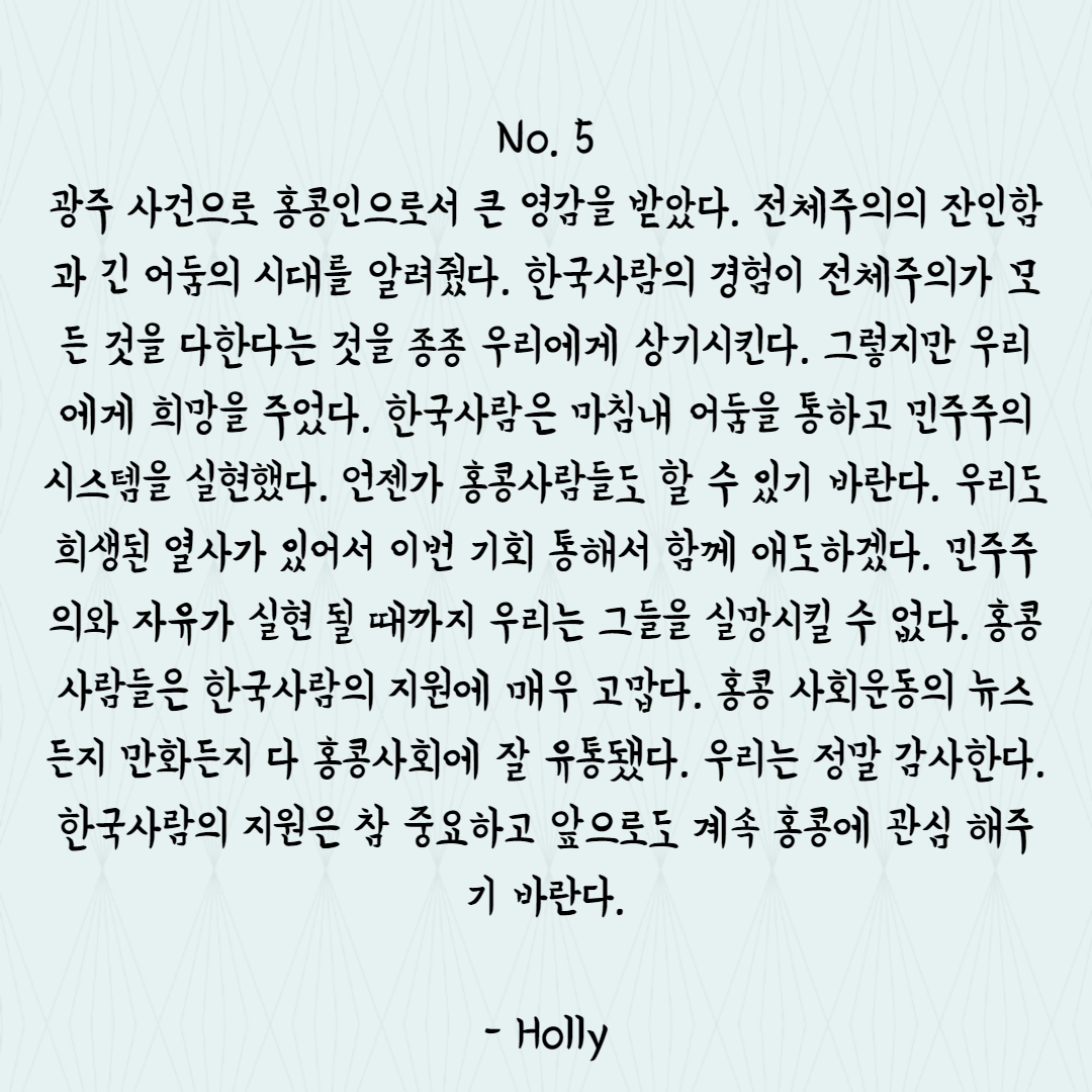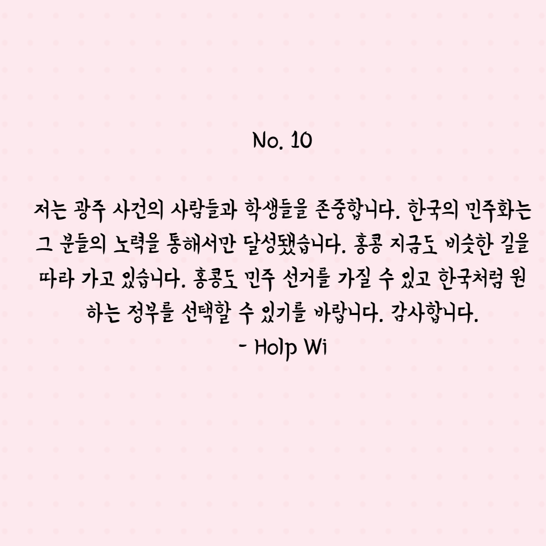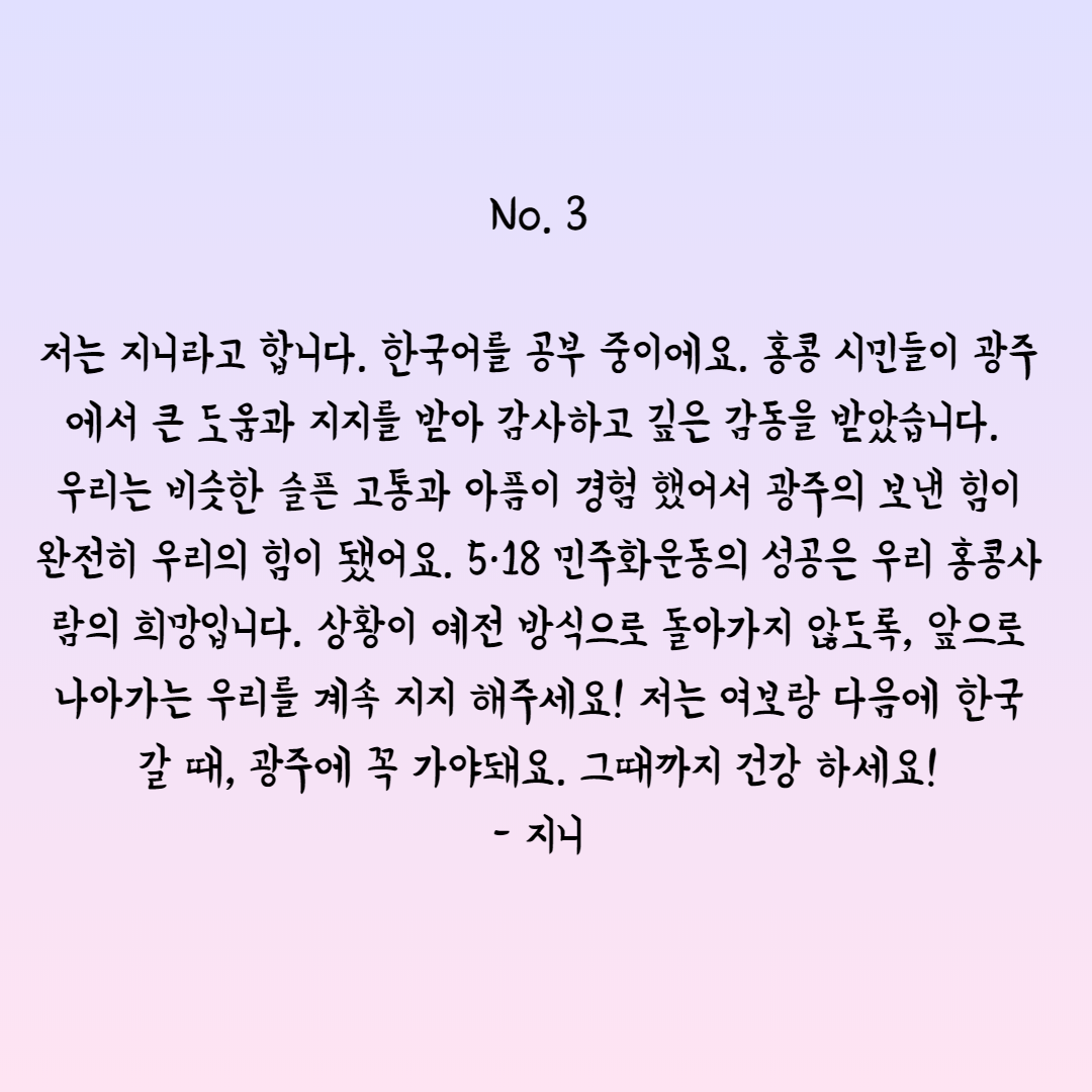 저는 지니라고 합니다. 한국어를 공부 중이에요. 홍콩 시민들이 광주에서 큰 도움과 지지를 받아 감사하고 깊은 감동을 받았습니다. 우리는 비슷한 슬픈 고통과 아픔이 경험 했어서 광주의 보낸 힘이 완전히 우리의 힘이 됐어요. 5·18 민주화운동의 성공은 우리 홍콩사람의 희망입니다. 상황이 예전 방식으로 돌아가지 않도록, 앞으로 나아가는 우리를 계속 지지 해주세요! 저는 여보랑 다음에 한국 갈 때, 광주에 꼭 가야돼요. 그때까지 건강 하세요!