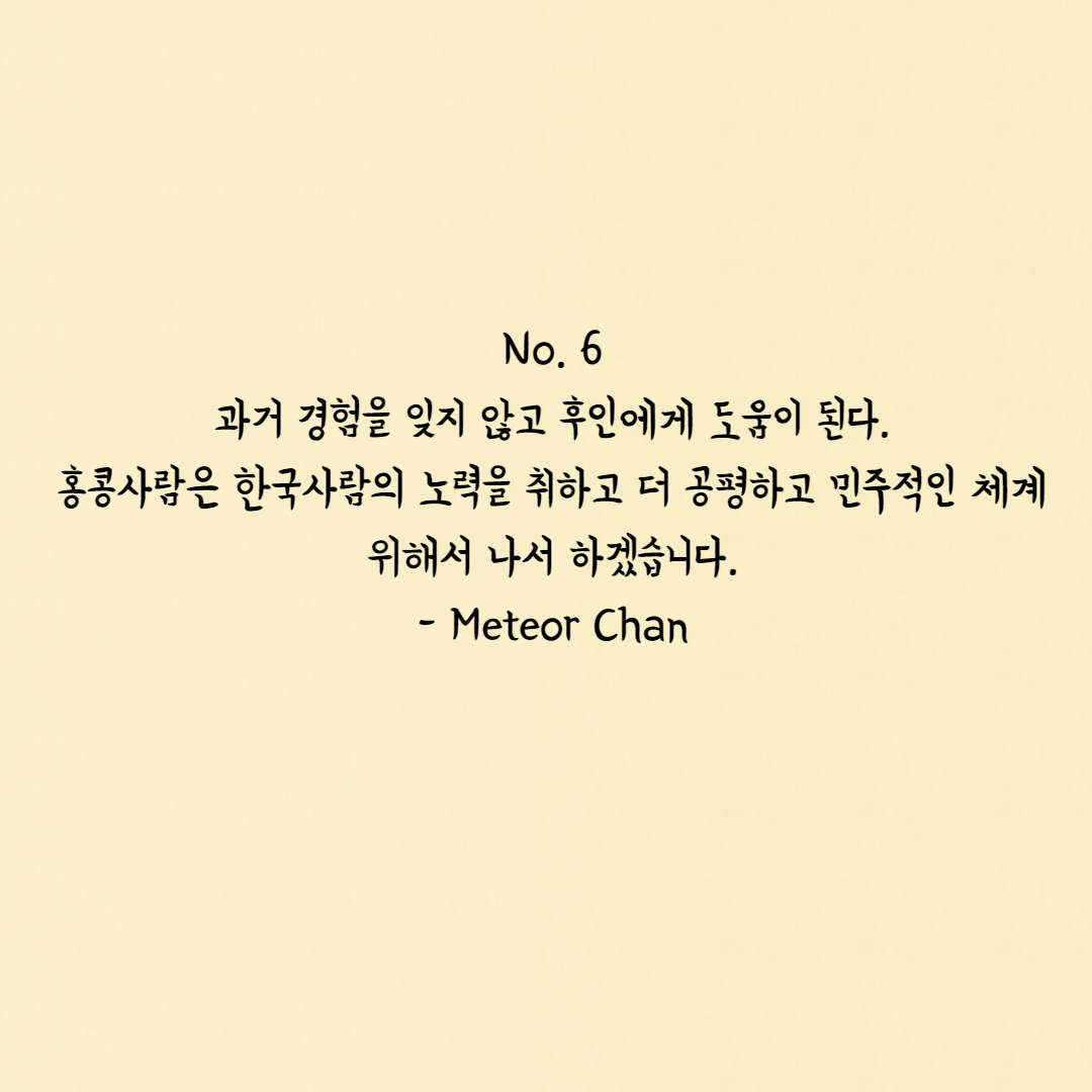 홍콩사람은 한국사람의 노력을 취하고 더 공평하고 민주적인 체계 위해서 나서 하겠습니다.