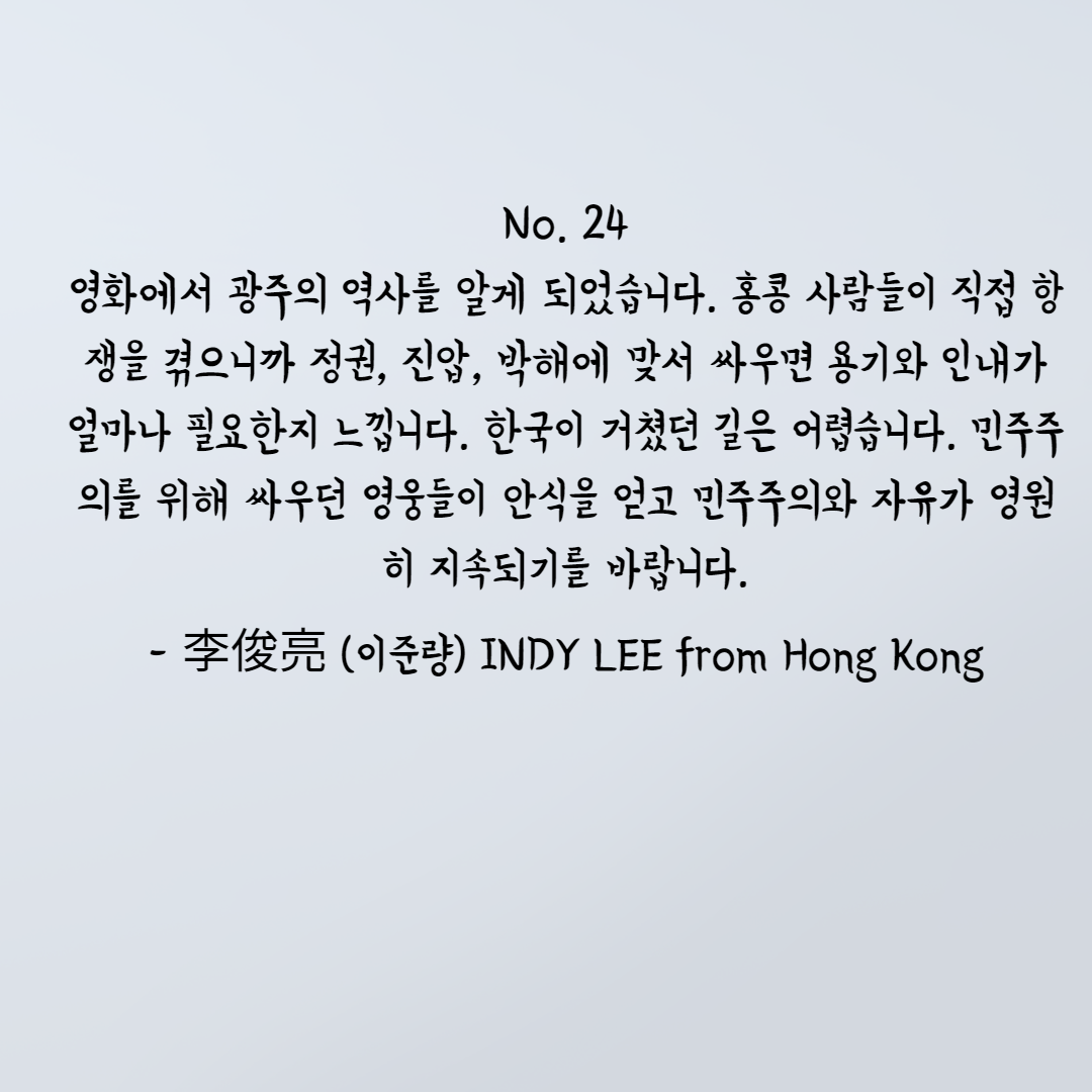 영화에서 광주의 역사를 알게 되었습니다. 홍콩 사람들이 직접 항쟁을 겪으니까 정권, 진압, 박해에 맞서 싸우면 용기와 인내가 얼마나 필요한지 느낍니다. 한국이 거쳤던 길은 어렵습니다. 민주주의를 위해 싸우던 영웅들이 안식을 얻고 민주주의와 자유가 영원히 지속되기를 바랍니다.