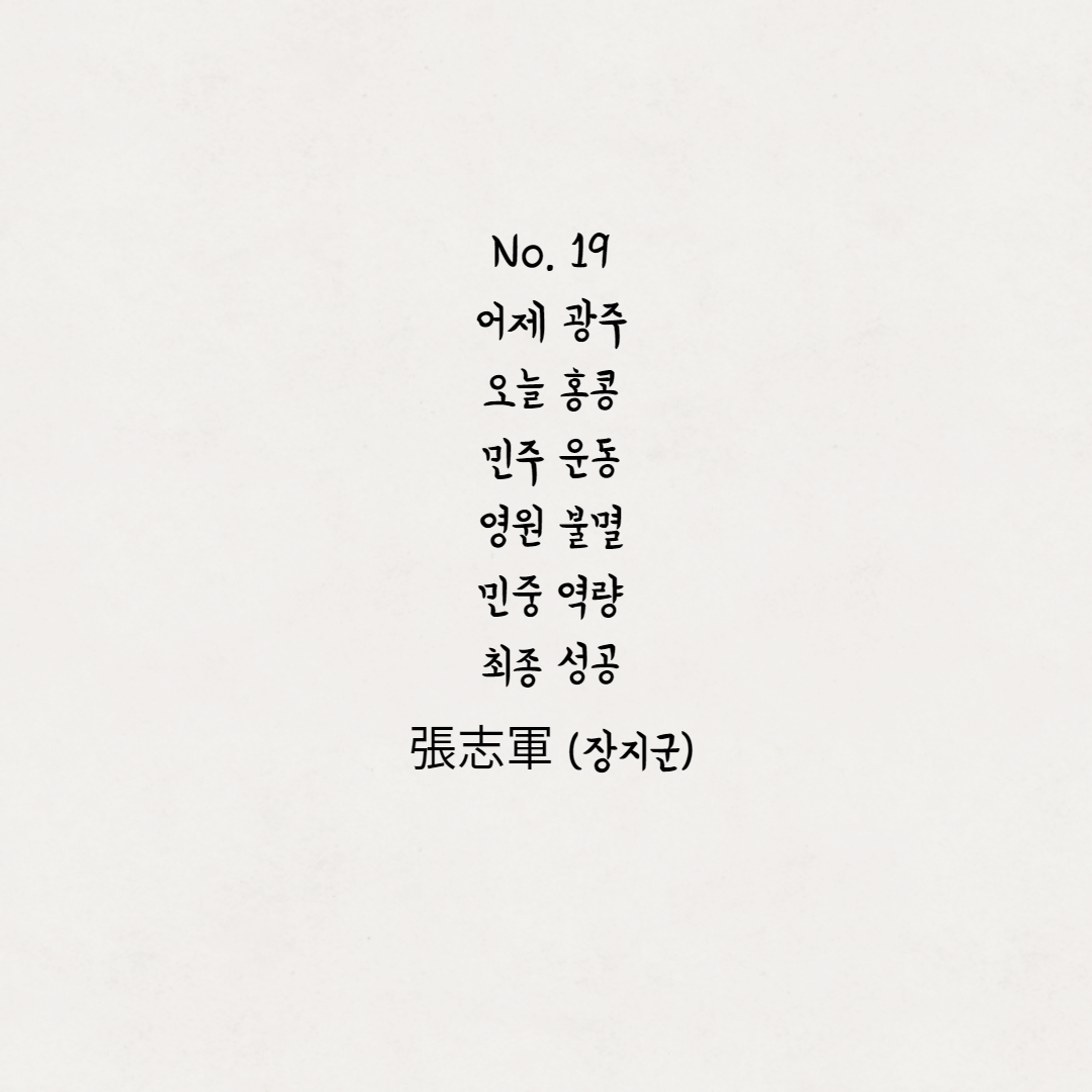요즘 홍콩은 대한민국 1980년대와 같은 항쟁 길에 걷고 있습니다. 지금의 한국은 진보하고 민주적인 길에 잘 걷고 있지만 홍콩은 후퇴하고 전체주의적인 정부를 직면합니다. 오늘날 홍콩 사람들의 무력감과 분노는 그때 광주의 인민들의 느낌이 비슷합니까? 한국사람은 광주 사건 후에 그 고통을 잊지 않았습니다. 홍콩사람도 산과 같은 무거운 압박을 당해도 광복날까지 그 모든 항쟁 과정을 잘 기억하기로 바랍니다.