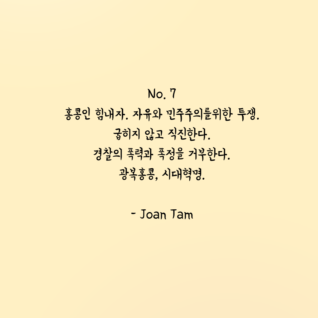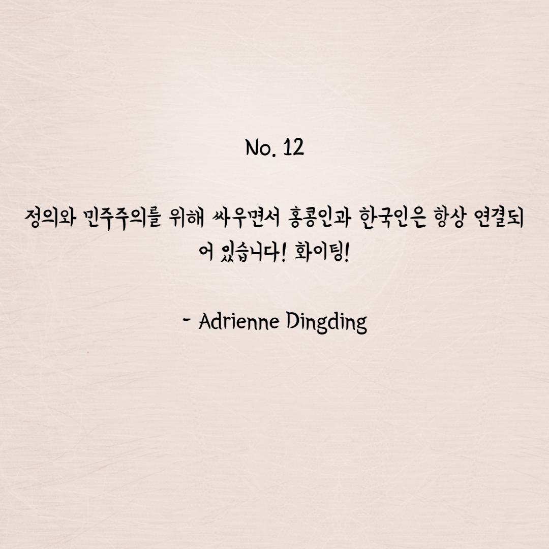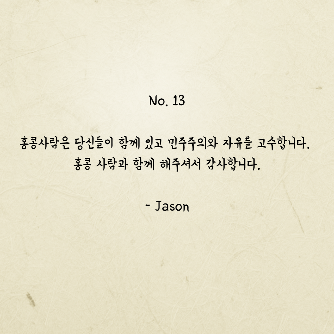 홍콩은 이제 빛 앞에 어둠에 직면 해 있으며 미래에 대한 불확실성으로 가득 차 있습니다. 지금이 순간에도 우리와 함께걸기를 바랍니다. 그래야 민주주의를 추구하는 길에 홍콩사람은 외롭지 않을 겁니다. 언젠가 홍콩이 한국과 민주주의의 기쁨을 공유 할 수 있기를 바랍니다.