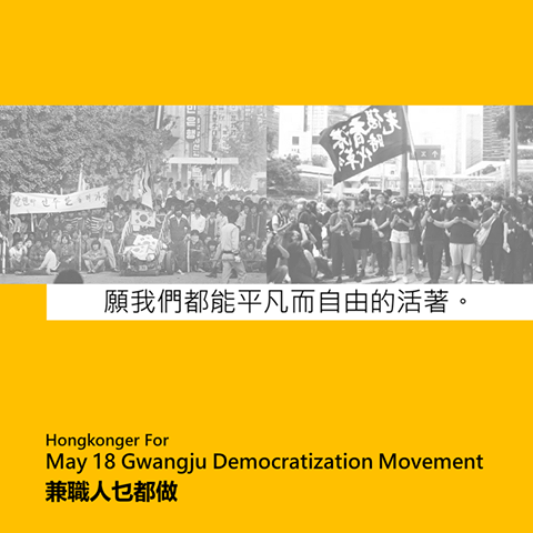 함께 민주주의를 추구하는 친구들에게: 오늘은 광주 "5.18" 사건이 40주년이 되었습니다. 과거 역사에는 여전히 많은 사람들의 이야기와 더 많은 진실을 발견해야 합니다. 알려진 사실에서, 당신은 민주주의를 추구하겠다는 용기와 결심을 보였으며 다음 세대를 위해 싸울 대가를 치렀습니다. 오늘의 대한민국은 당신과 당신의 조상들과 함께 만들었습니다. 그리고 당신의 역사는 같은 민주주의를 추구하는 홍콩사람들에게 참고와 격려가되었습니다.