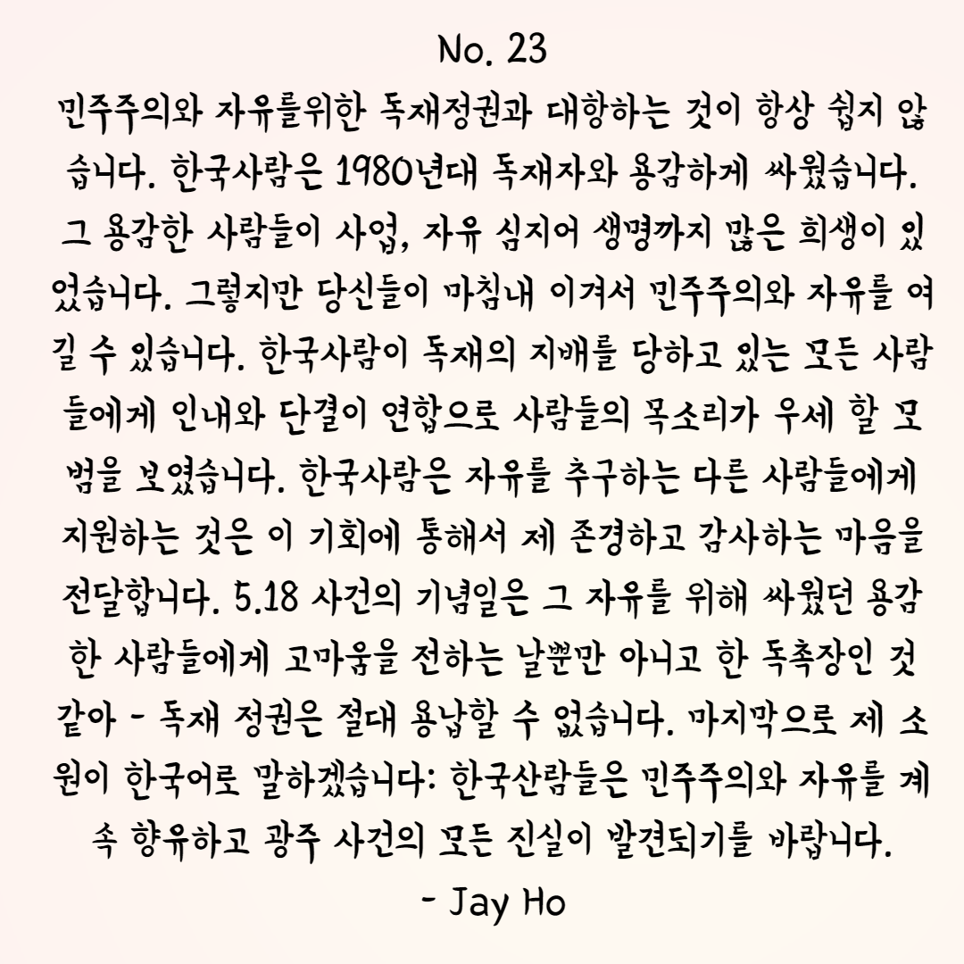 민주주의와 자유를위한 독재정권과 대항하는 것이 항상 쉽지 않습니다. 한국사람은 1980년대 독재자와 용감하게 싸웠습니다. 그 용감한 사람들이 사업, 자유 심지어 생명까지 많은 희생이 있었습니다. 그렇지만 당신들이 마침내 이겨서 민주주의와 자유를 여길 수 있습니다. 한국사람이 독재의 지배를 당하고 있는 모든 사람들에게 인내와 단결이 연합으로 사람들의 목소리가 우세 할 모범을 보였습니다. 한국사람은 자유를 추구하는 다른 사람들에게 지원하는 것은 이 기회에 통해 서제 존경하고 감사하는 마음을 전달합니다. 5.18 사건의 기념일은 그 자유를 위해 싸웠던 용감한 사람들에게 고마움을 전하는 날뿐만 아니고 한 독촉장인 것 같아 - 독재 정권은 절대 용납할 수 없습니다. 마지막으로 제 소원이 한국어로 말하겠습니다: 한국산람들은 민주주의와 자유를 계속 향유하고 광주 사건의 모든 진실이 발견되기를 바랍니다.