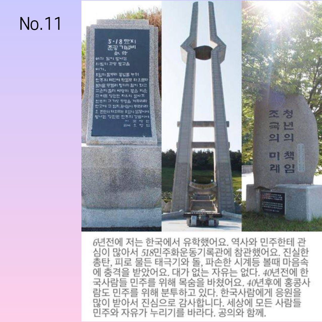 40년 전 광주에서 민주화운동 있었습니다. 저는 광주시민들을 민주하고 자유로 쟁취하려고 감상합니다 ! 저는 한국시민들은 홍콩의 민주화운동 지지 할 수 있기를 바랍니다. 같이 화이팅 !