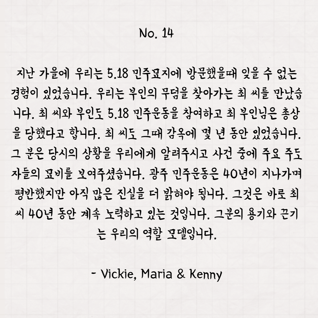 지난 가을에 우리는 5.18 민주묘지에 방문했을때 잊을 수 없는 경험이 있었습니다. 우리는 부인의 무덤을 찾아가는 최 씨를 만났습니다. 최 씨와 부인도 5.18 민주운동을 참여하고 최 부인님은 총상을 당했다고 합니다. 최 씨도 그때 감옥에 몇 년 동안 있었습니다. 그 분은 당시의 상황을 우리에게 알려주시고 사건 중에 주요 주도자들의 묘비를 보여주셨습니다. 광주 민주운동은 40년이 지나가며 평반했지만 아직 많은 진실을 더 밝혀야 됩니다. 그것은 바로 최씨 40년 동안 계속 노력하고 있는 것입니다. 그분의 용기와 끈기는 우리의 역할 모델입니다.