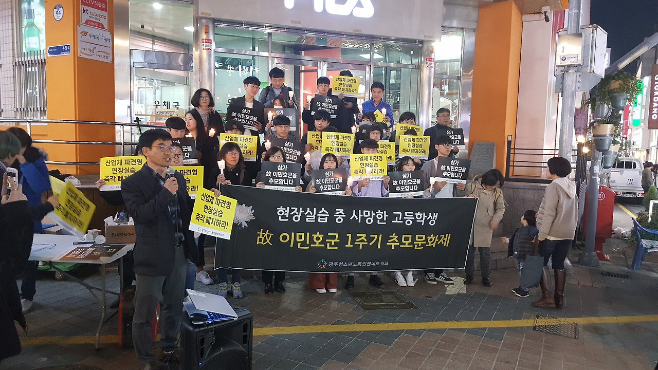 지난 2018년 11월, 광주에서 현장실습 중 사망한 제주도의 고등학생 고 이민호군 1주기 추모문화제가 진행되고 있다