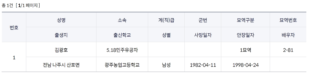 김광호씨는 국립5.18민주묘지 2-81 묘소에 묻혔다. 그러나 오늘 묘역을 살펴 보니 그의 묘소는 비어 있었다. 가족들이 이장한 것으로 추정된다. 혹여 그렇다면.. 그 심정을 충분히 이해할 수 있을 것 같았다.