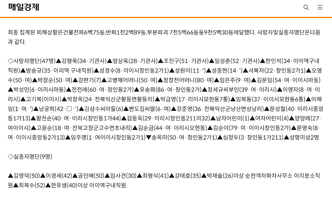 사건 발생으로부터 3일 후인 11월 14일 <매일경제>가 현재까지 발생한 인명피해라며 사망자 47명, 실종자 9명의 명단을 발표했다. 이 명단에 포함된 실종자 9명은 사망자로 전환되었을 것이다. 그렇다면 이 명단에는 사망자 59명 중 56명이 포함돼 있다고 봐야 한다. 그러나 이 명단을 자세히 살펴 본 결과, 20·30 여성으로 보이는 희생자는 많게 봐도 3명 정도로 보였다. 사고가 발생한 곳은 판자촌과 홍등가가 난립했던 슬럼 지역이었고, 거대한 폭발로 인해 지름 40m, 깊이 15m에 달하는 거대한 구덩이가 파이고 반경 500m 이내에 위치한 건물들이 전파되는 등의 피해가 발생했음을 감안하면 납득하기 어려운 명단이다.