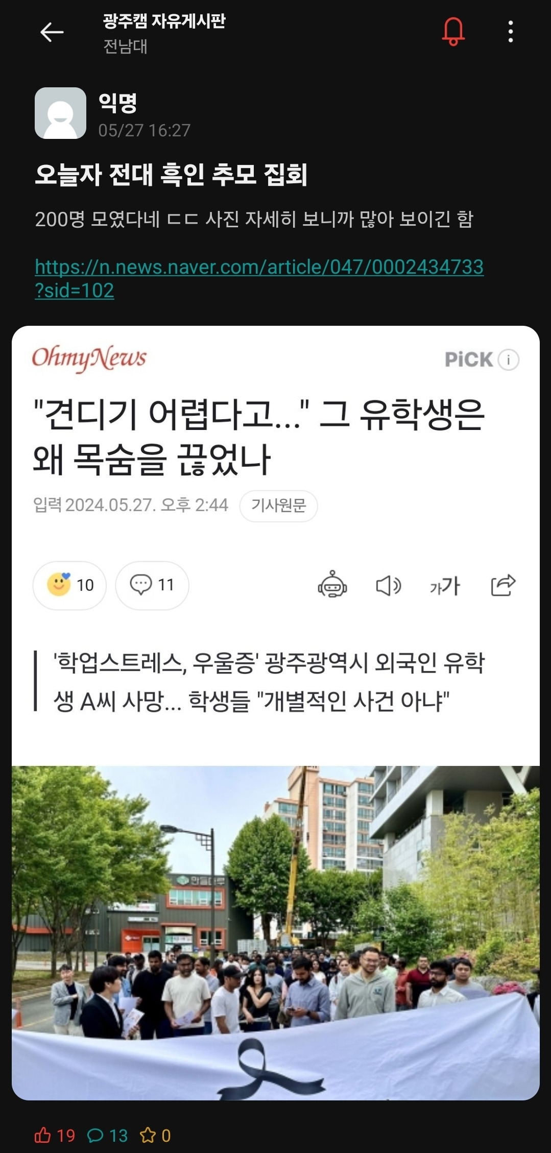 직후, 2024년 5월 27일 오전 11시 45분 경부터 전남대 공과대학 G&R HUB에서 학생들의 추모 집회가 있었다. 해당 집회를 취재해 아래와 같은 내용의 기사를 냈다.