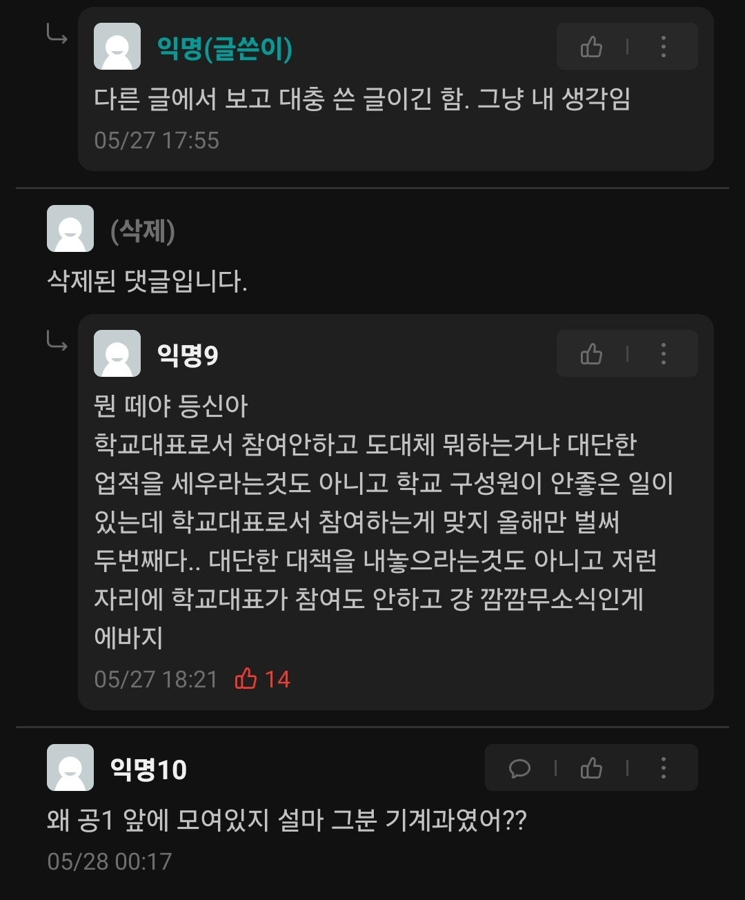 사건 초기에는 조롱이나 혐오의 내용이 담긴 게시글도 있었지만, 공론화 후에는 학교를 비판하는 주장이 많았고, 학내 문제에 대한 총학생회의 대응 부재를 지적하는 주장도 있었다. 어떤 학생이 '알빠노'라는 댓글을 달자 이에 대한 반론이 나왔고, 많은 학생들이 해당 반론에 공감했다. 여기까지가 이번 일에 대한 흐름이었다.