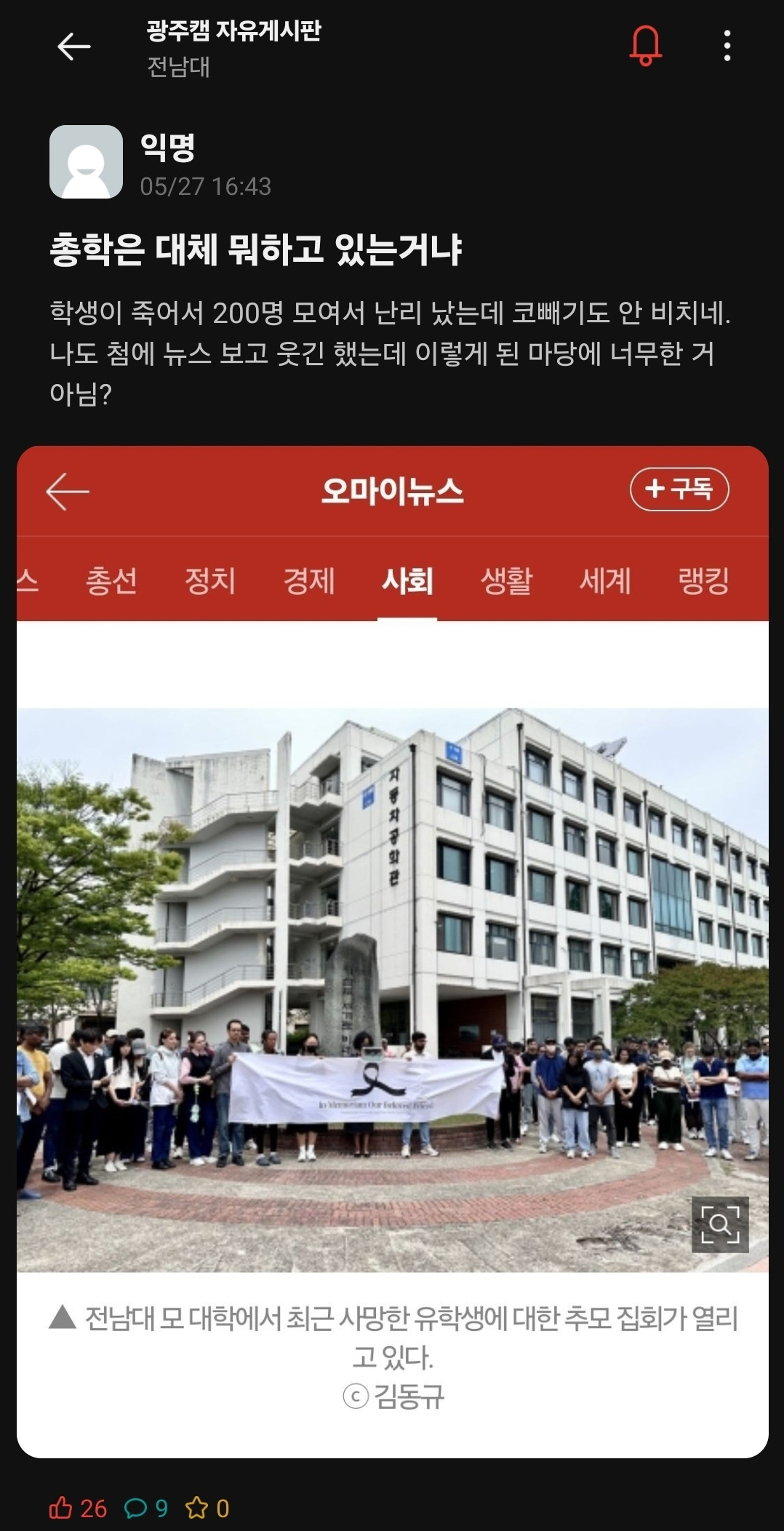 기사를 작성한 직후부터 관련 반응을 체크했다. 가장 중점을 둔 곳은 당연히 전남대 내부였다.