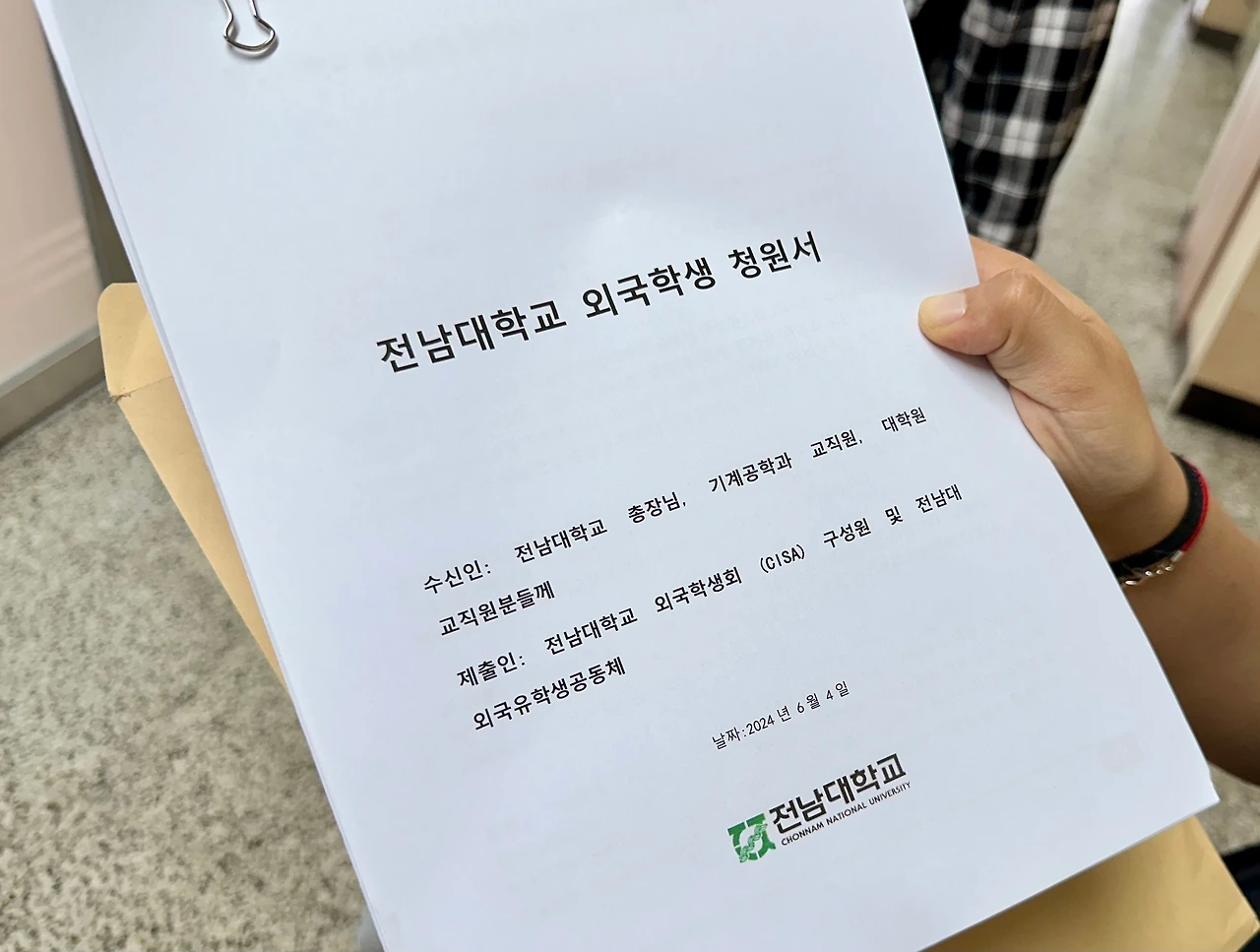 지난 4일 전남대 국제협력과는 전남대 국제학생회 'CISA' 관계자 및 일부 유학생들의 청원서 수령을 거부하며 "이 문제에 대한 대응은 대외협력실에서 맡기로 했다. 그래서 우린 받고 싶어도 받을 수 없다"고 했다. 그러나 일부 유학생들의 요구가 이어지자 결국 같은 날 늦은 오후에 다시금 유학생들을 만나 청원서를 수령했다.