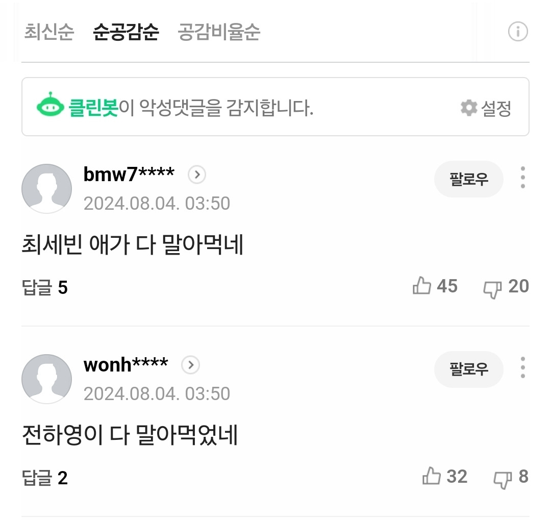 이날 새벽 경기를 끝까지 본 후 언론의 반응을 살폈다. 경기 결과가 속보로 보도됐는데, 댓글에 최세빈, 전하영 선수에 대한 비난이 쇄도하고 있었다. 그 어떤 뉴스를 봐도 죄다 같은 류의 비난이 있었다. 그냥 넘어가기엔 솔직히 심각했다.
