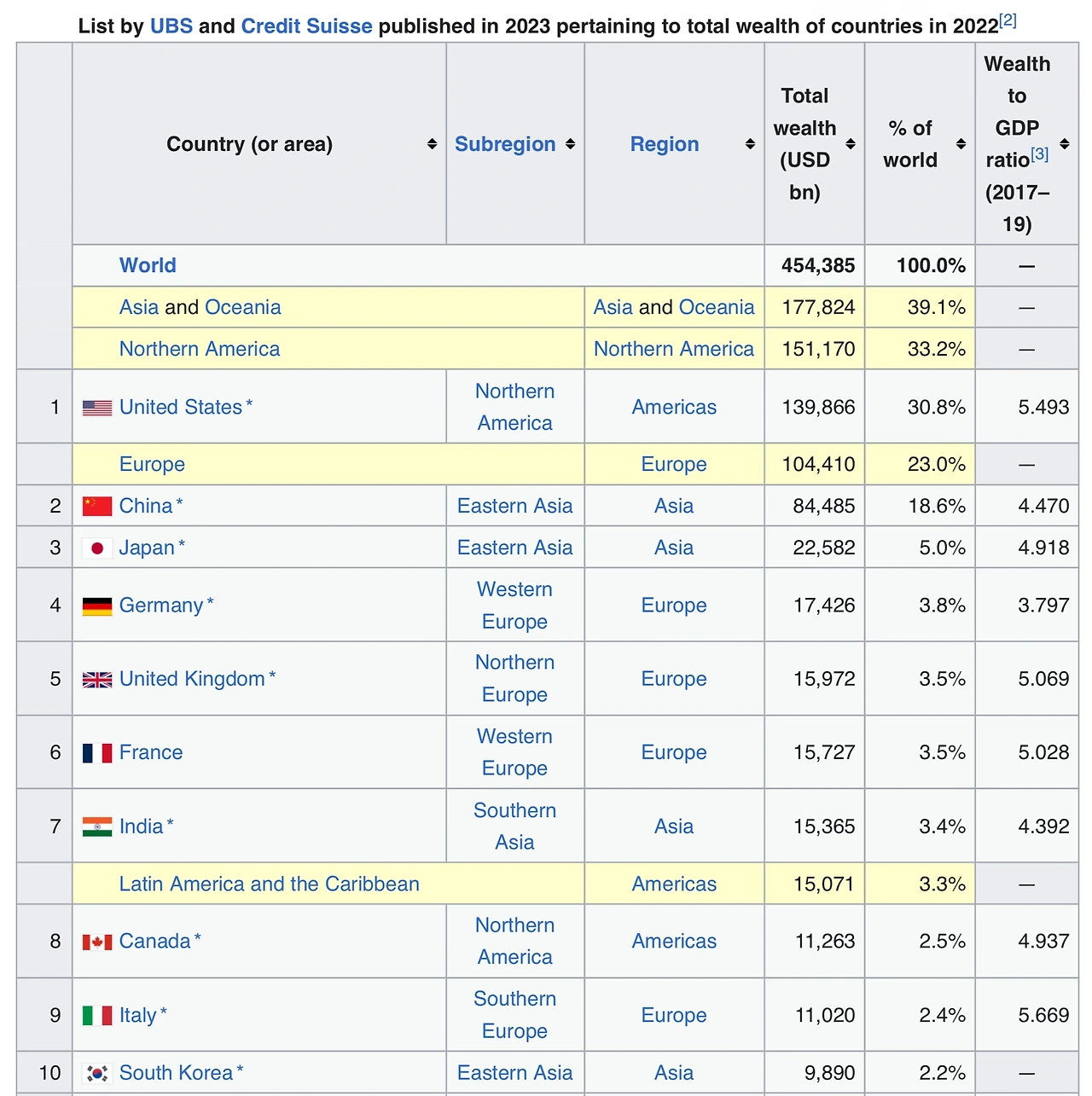 "한국이 강대국들 사이에서 근성으로, 잘 버티고 있다"는 평가도 있다. 그러나 한국은 이미 극도로 부유한(extremely wealthy) 국가다. 아래 첨부한 사진에 나오듯 한국은 세계에서 10번째로 많은 부를 소유한 강대국이다.