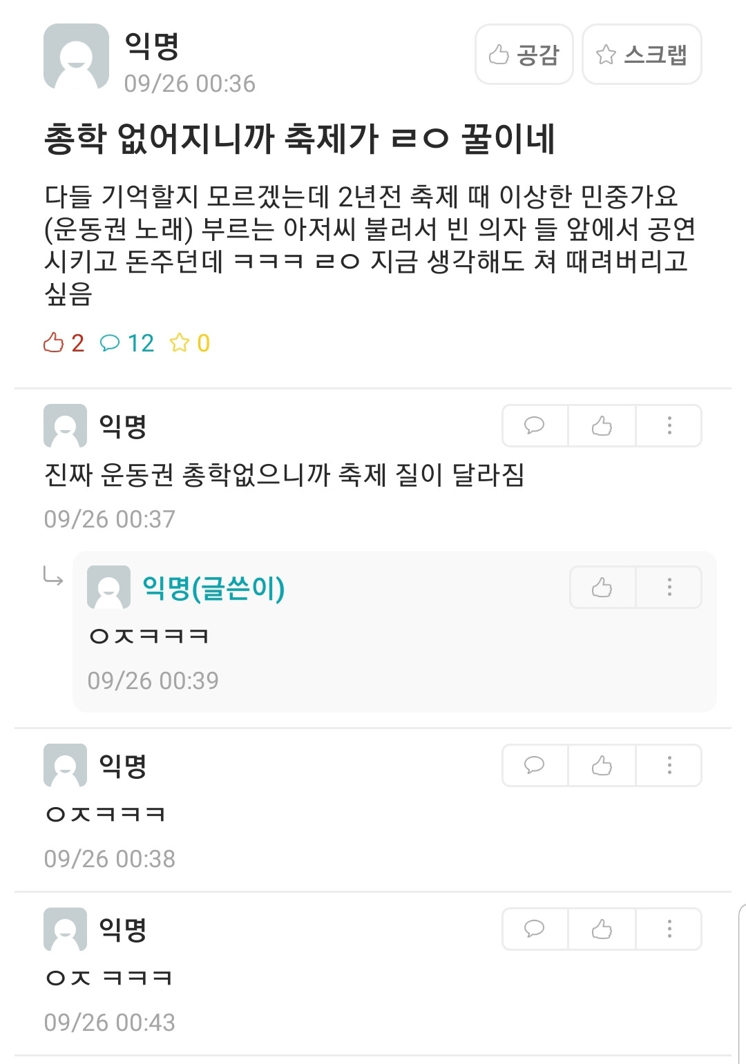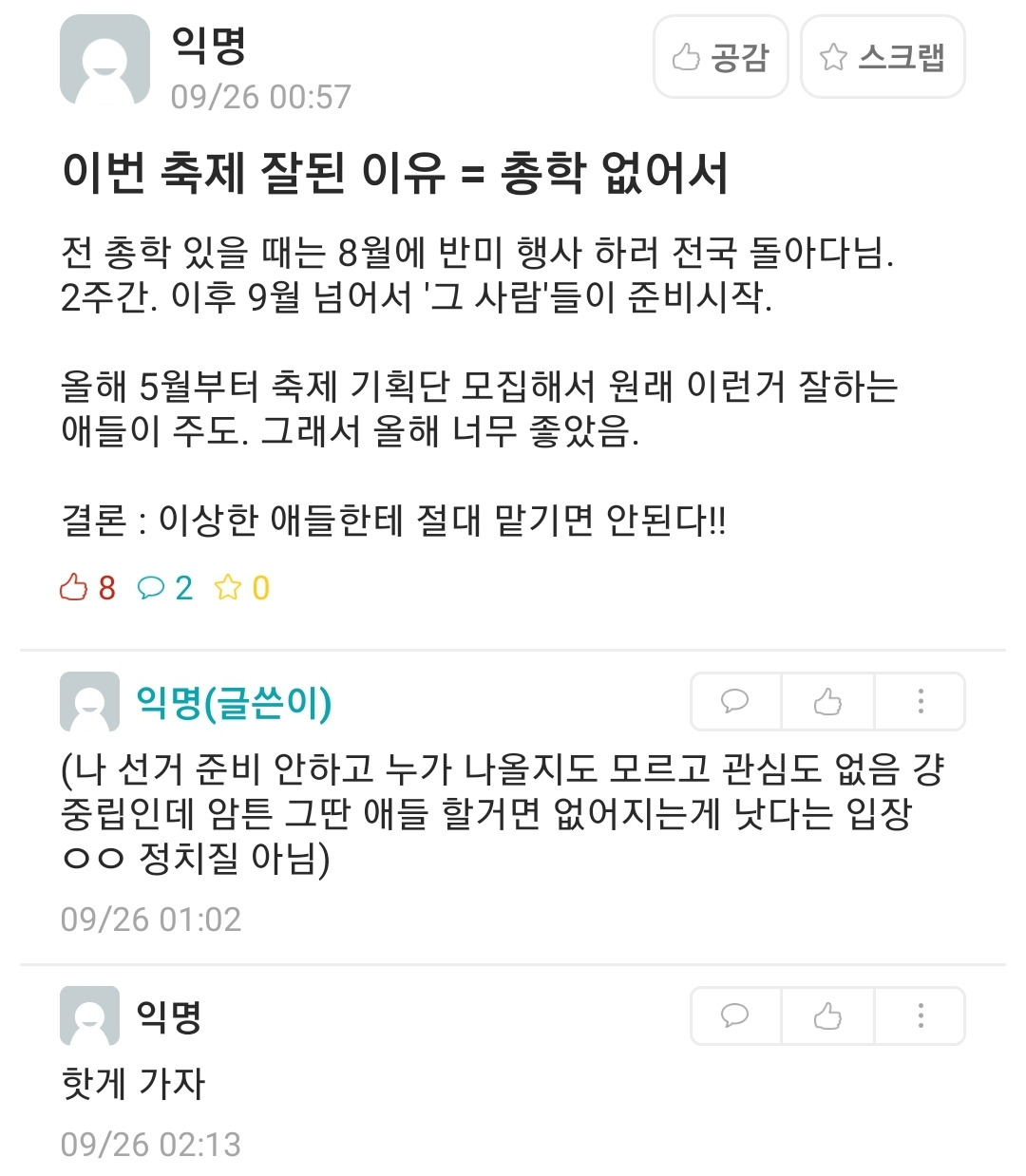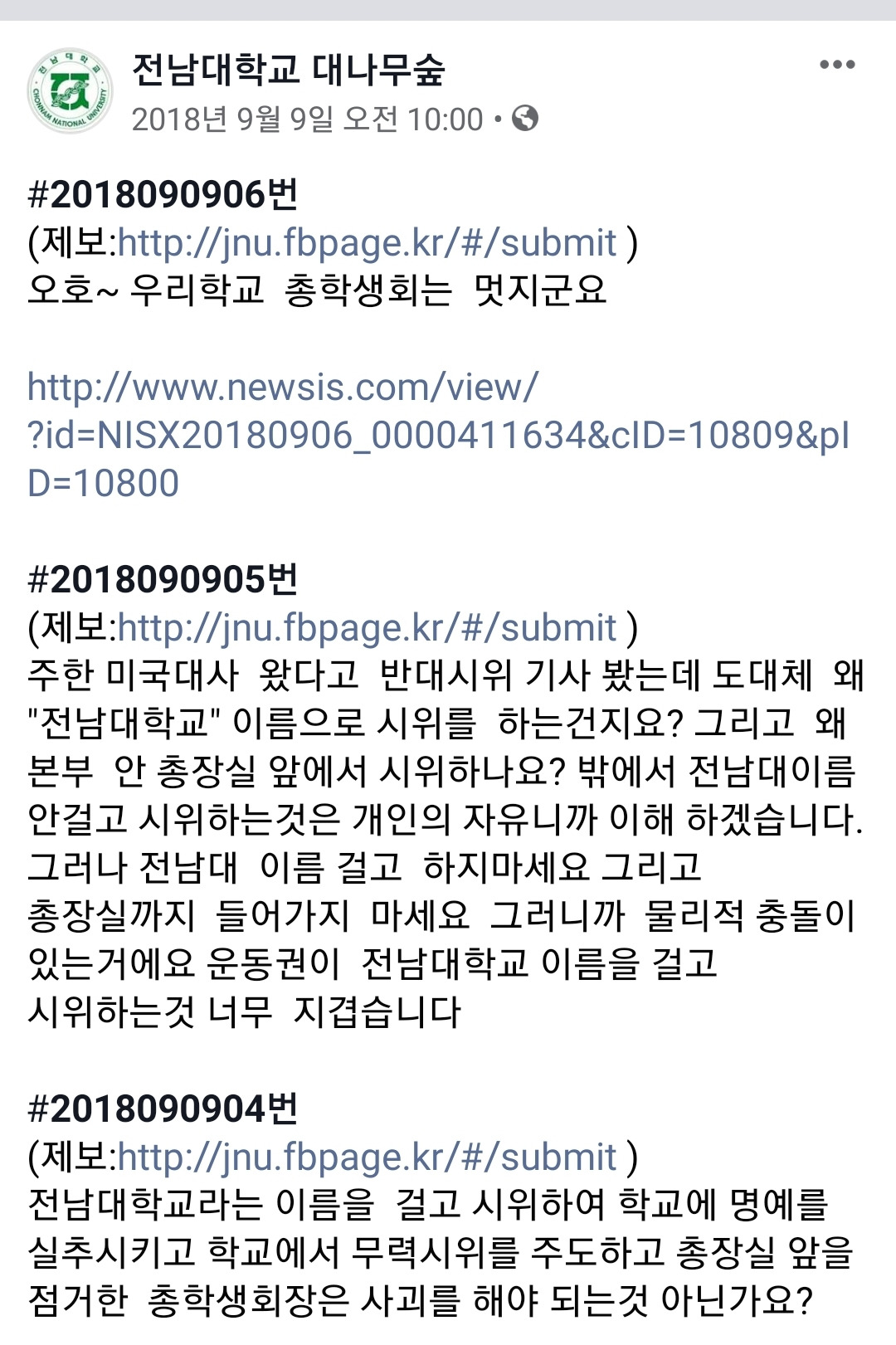 2019년 9월, 전남대학교 축제가 성황리에 진행되었다. 임창정 등의 가수의 공연은 물론이고 전체적인 진행과 구성, 기획 자체가 트렌드에 맞게 잘 진행되었다. 학생들이 소통하는 공간인 전남대 에브리타임에는 축제에 대한 칭찬의 글들이 올라왔다. 이어 몇 년 전의 축제를 경험했던 이들을 중심으로 전 총학에 대한 비토도 쏟아졌다. 총학이 없어도 축제가 잘되니까, 앞으로도 '그 총학' 없이 좋은 축제를 즐기며 행복한 대학생활을 하고 싶다. 이것이 학생들을 부끄럽게 만들던 전 총학이 조성한 2019년 현재 전남대학교 재학생들의 압도적인 여론이다.