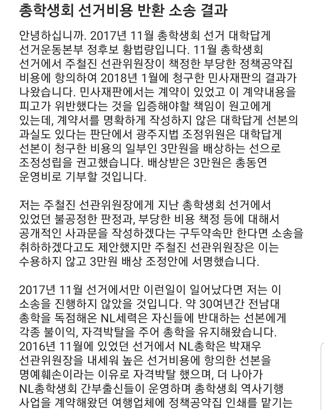 한편, 전년도 선거에 출마했던 황법량은 총동아리연합회 선거에 출마, 부회장으로 당선되어 활동하고 있었다. 그는 전년도 정책공약집 비용이 과도하게 책정되었다고 주장했다. 이에 전년도 중앙선거관리위원장 주철진을 상대로 민사소송을 제기했다. 해당 소송은 3만 원을 돌려받는 것으로 종결되었고, 사실상 정책공약집 비용 책정이 잘못되었음이 인정된 내용상의 승소였다. 황법량은 재판 결과 공개와 함께 2016년 선거 당시 기존 세력이 운영하는 여행업체 '아시아 컬처 커뮤니티'가 정책공약집 인쇄를 진행했음을 폭로했다. '아시아 컬처 커뮤니티'는 NL소속 전남대 총학 출신들이 소속된 사업체로 여행업체로 등록되어 있다. 황법량의 폭로는 그동안 NL 세력이 설립한 사업체가 전남대학교의 여러 위탁 사업을 따왔음에 대한 폭로이자 올해 선거를 공정하게 치르라는 경고였다. 해당 업체는 실제로 전남대의 예산으로 여러 기행 사업을 진행해왔다.