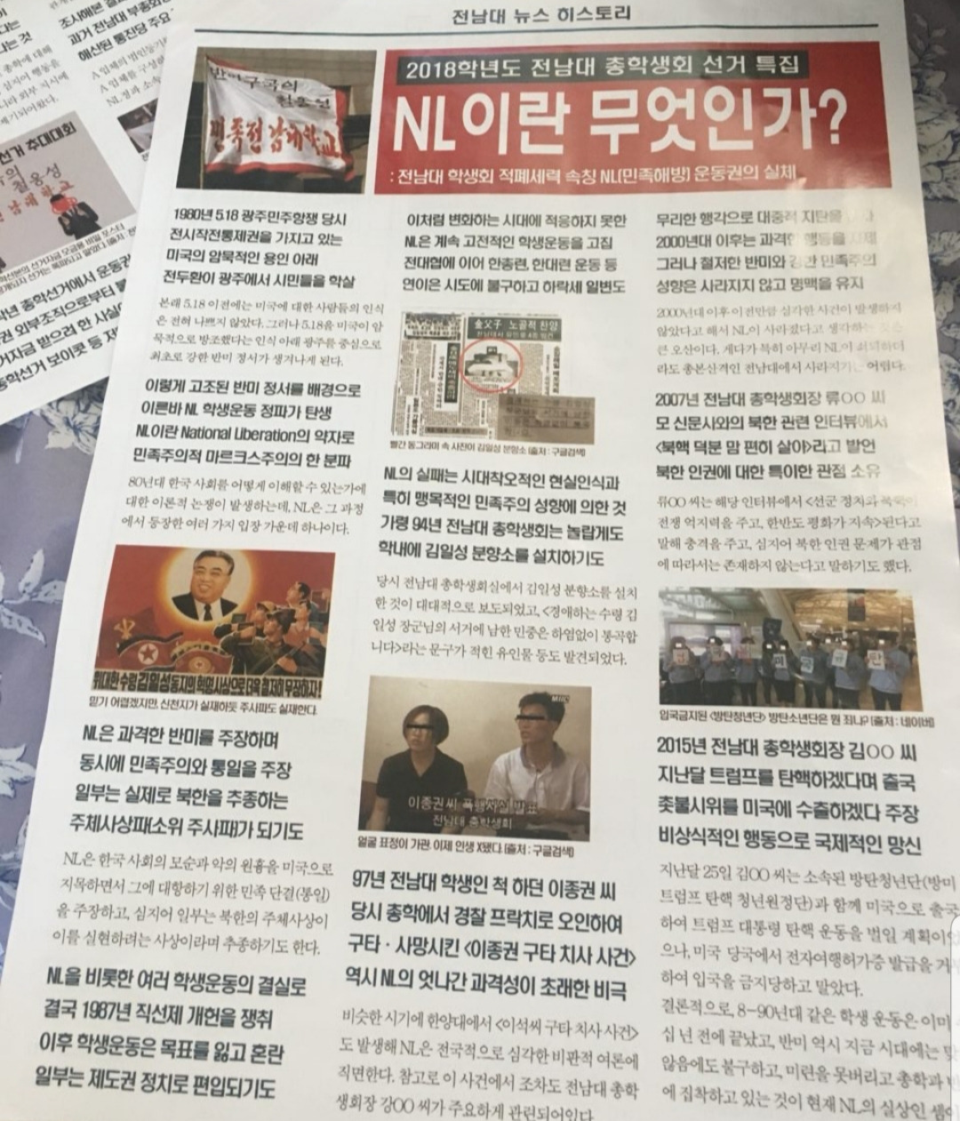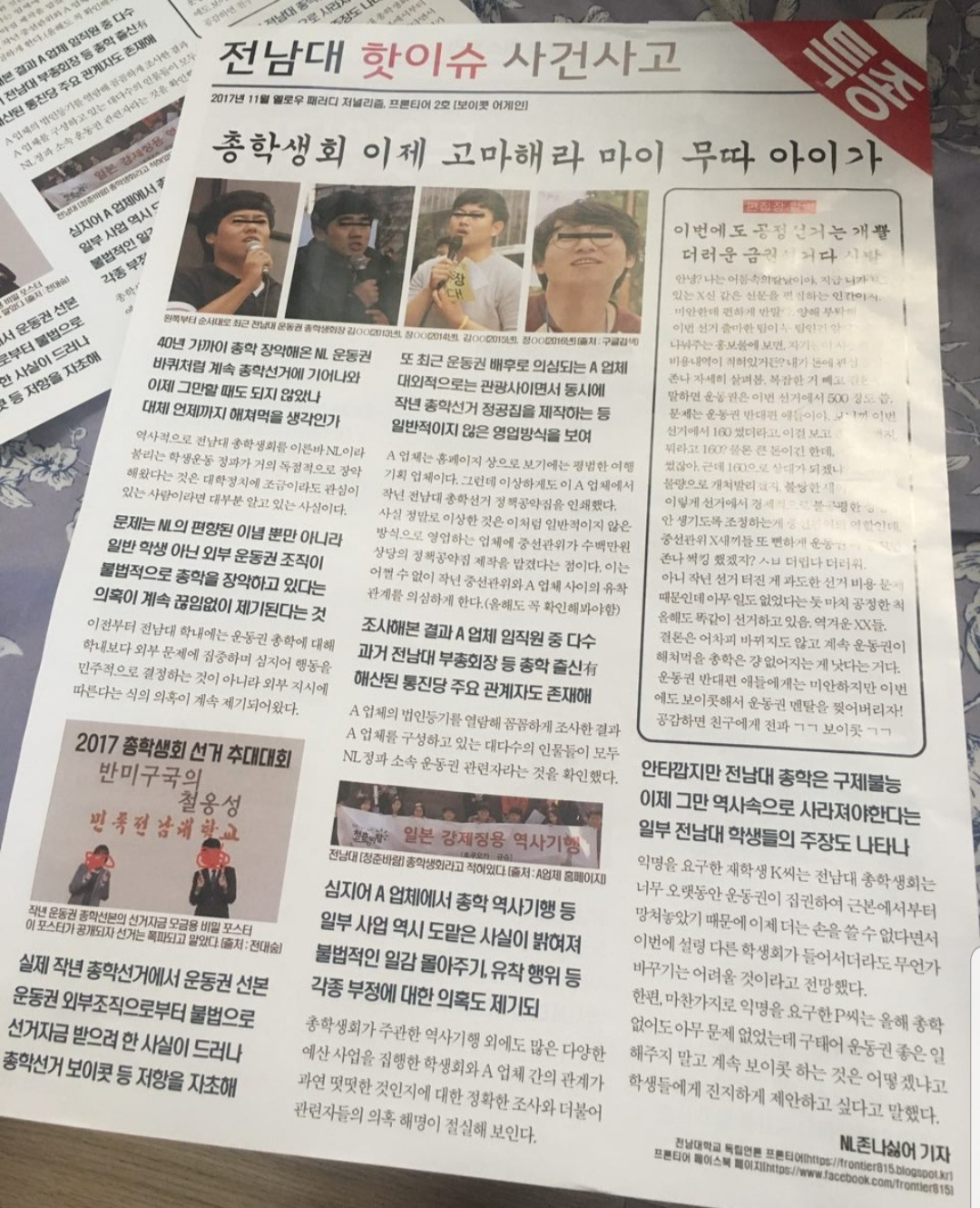 2017년 11월 20일, 총학선거 진행 자체에 불만을 가졌던 일부 재학생들이 'NL이란 무엇인가?'라는 유인물에 전남대학교 NL 세력의 역사를 담아 배포했다. 이들은 '너에게' 선본 측에 호응하여 보이콧 운동에 참여했던 이들이었다. 그러나 보이콧이 성공한 이후 '인디' 및 '대학답게' 선본에는 합류하지 않았다. 이들은 엘로우 패러디 저널리즘을 주장하며 "대체 언제까지 해쳐먹을 것인가"라는 식의 문장으로 기존 학생회 측을 강력하게 비난했다. 그러나 유인물 배포는 제대로 진행되지 못했고, 배포와 동시에 중선관위 측의 저지를 받았다.