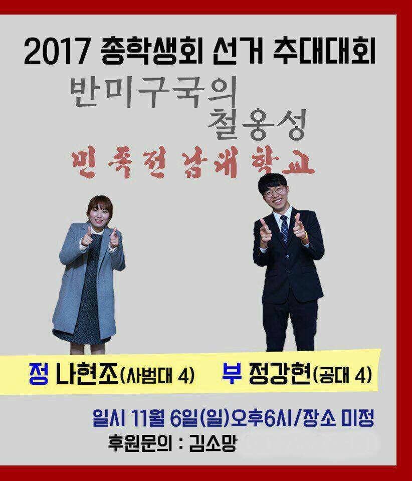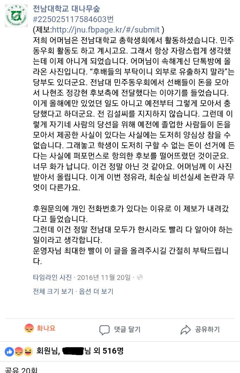 2016년 11월 20일, 2017년도 전남대 총학생회 선거를 하루 앞두고 페이스북 페이지 '전남대학교 대나무숲'에 올라온 하나의 제보가 전남대학교를 뒤흔들었다. 자신을 전남대 민주동우회 활동가의 자녀라고 밝힌 전남대 재학생이 전남대 졸업생들이 돈을 모아 나현조, 정강현 선본 측에 전달했다는 사실을 폭로했다. 그는 특히 나현조, 정강현 선본이 재학생들에게는 공유된 바 없는 '비공식 후원 포스터'를 졸업생들에게 비밀리에 배포한 후 선거 추대대회를 진행하여 돈을 모았으며, 이들 세력이 매년 이러한 비밀 행사를 통해 선거자금을 모아 왔다고 폭로했다.