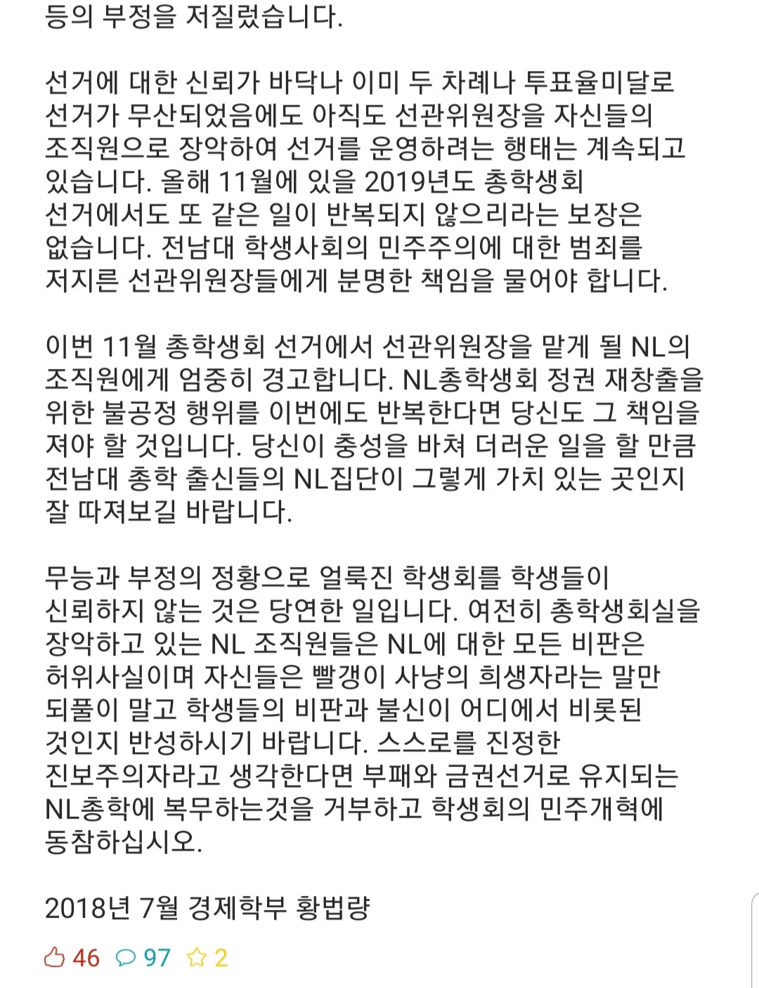 20. 전남대 총학생회, NL 세력의 무능과 부패 (2018)