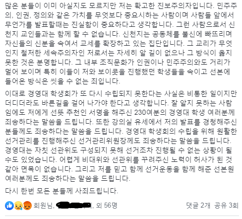 [신천지 나희진] 선관위원장이 각 선본들에게 학우분들께 하고 싶은 말 있으면 하라고 하더라고요.