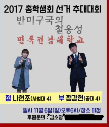 그가 제공한 '비공식 포스터'에는 '후원문의 - 김소망'이라는 문구와 연락처가 분명히 명시되어 있었다. 김소망은 2011년도 총학생회 선거 당시 중앙선거관리위원장을 맡아 학내 민주주의에 악영향을 끼쳤으며, 2017년도 선거 당시 나현조, 정강현 후보의 '언제나 니곁에' 선본의 선본장을 맡고 있던 인물이다. 해당 폭로는 적폐(積弊) 세력의 진상을 명확하게 보여주었다.