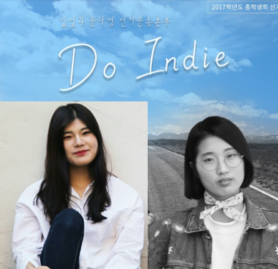 2017년 3월, '너에게' 선본이 선본명을 '인디'로 변경했다. 이들은 총학생회 재선거에 김설(정치외교 12), 문다영(생물공학 14) 후보를 내보냈다. 당시 선거에는 정재인, 김경한 후보의 '이거레알' 선본과 최도형, 백효인 후보의 '아는총학' 선본이 추가로 출마했다. 전년도에 출마한 두 선본이 재선거에 출마하지 못했음에도 3팀이 선거에 나선 것이다.