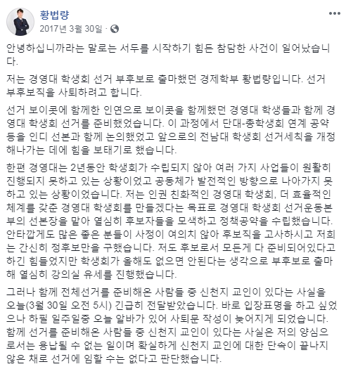 필자는 광주청년유니온에서 김설씨와 함께 활동해왔고, 황법량씨와도 막역한 사이로 지내왔다. 2016년 이후의 전남대 총학생회 선거에 직간접적으로 연루되기도 했다. 기록은 의무이기에, 현재 시점에서 조망할 수 있었던, 기록되어 마땅한 역사를 이렇게 남겨두고자 한다.