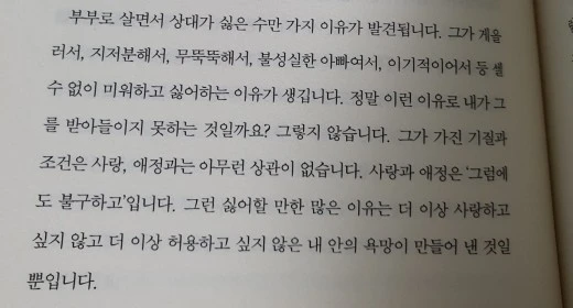 남편 입장에서 보면 아내라는 사람은 남편이 아닌 타인의 반응이 우선이었던 것이다. 남편의 감정보다는 우리를 바라볼 이목에 아내인 나는 더 신경이 곤두서 있었기 때문이다. 그리고 아내로서 남편이 이렇게 바뀌면 혹은 남편이 이렇게 해주면 난 더 행복할 거야 라는 기대감을 가지고 내 기대와 만족만을 남편에게 요구하기도 했다. 책에서 적나라하게 표현한 '충돌'과 '물어뜯음'은 나의 무기였던 셈이다. 그리고 그런 기제를 일삼았던 부부관계였기에 그 이상은 생각할 수도 없고 충돌과 물어뜯음이 없이는 부부 존재의 이유가 불명확하기까지 했다.