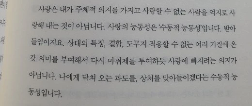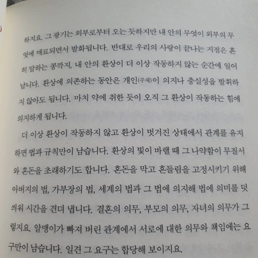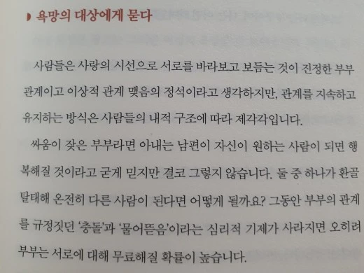 바로 도서관으로 가서 이 책을 영접(?)하고 이 책 역시 가장 집중이 잘 되는 밤 시간에 한줄한줄 아껴 읽었다. 그리고 이후 브런치 글에서도 인용을 하기도 했고 책 내용에서 많은 질문을 얻어 그 질문에 대한 스스로의 대한 답도 찾으며 우리 부부 사이의 변곡점을 찾는 기회로 삼았다. 특히 아내로서 나의 본질적인 위치와 태도에 대한 인식의 변화에 큰 영향을 주었다.