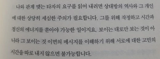 글이라는 게 신기하네요. 책을 읽으면서 떠오른 질문의 결과 사뭇 다르게 글이 써지네요. 이것 역시 글쓰기의 힘이겠죠? 책을 읽으며 떠오른 질문에 내 답을 찾아가고 그것이 진짜 내 질문과 답이 되기 위해 이렇게 글로 풀어내는 과정이 필요한가 봅니다.