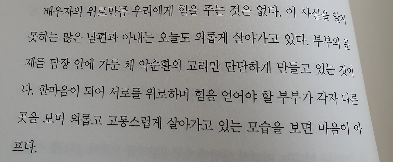 올초 들어서 남편에 대한 생각과 깊은 고민은 자연스레 부부관련 책에 손이 가게 만들었고 부부관련 책이 아니어도 책 속에서 만나는 문장마다 남편에 대한 고민에 대한 해답들이 속속들이 까꿍하며 나에게 미소를 던졌다.