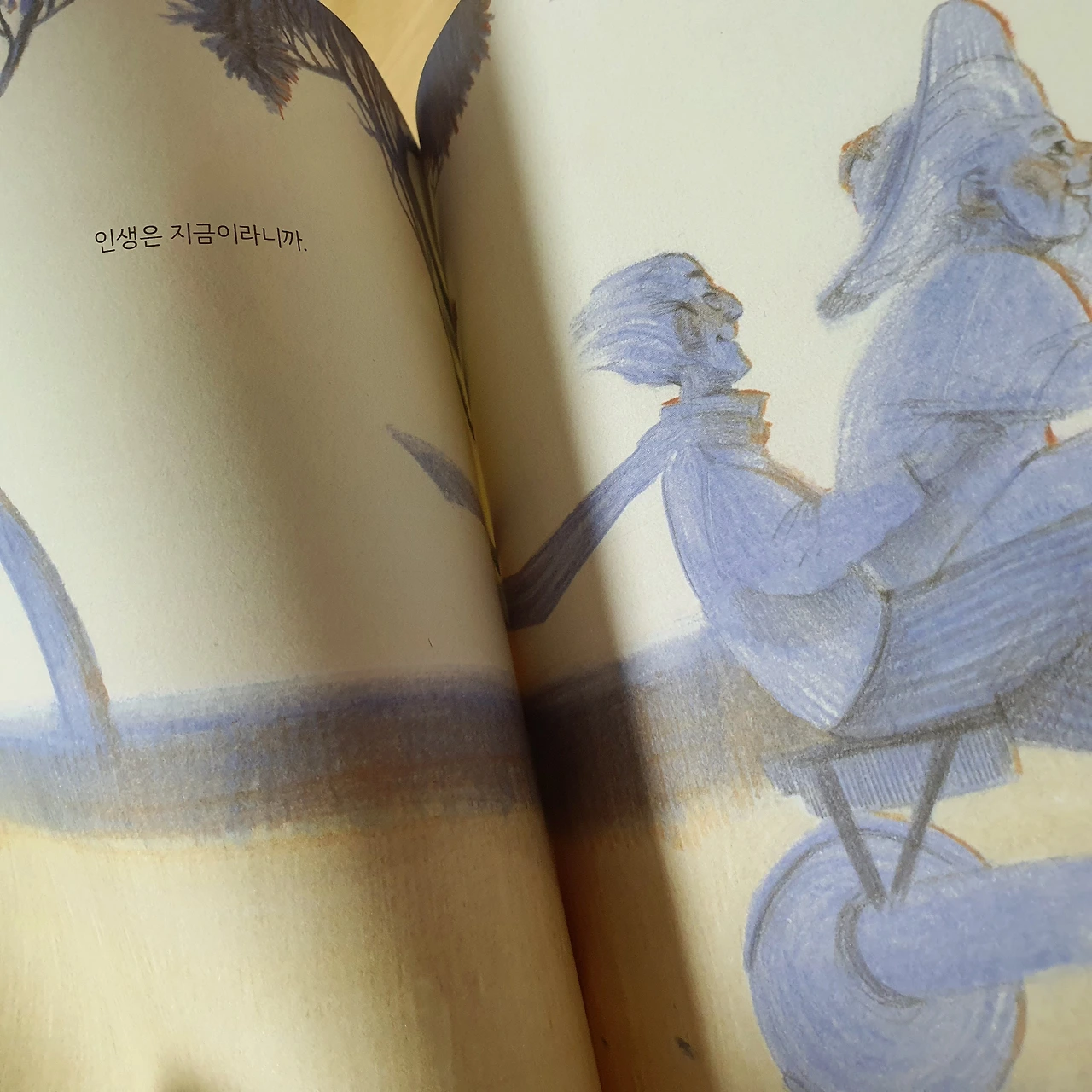 그림책 속 노인부부는 은퇴 후 자유로운 삶을 꿈꾼다. 하지만 그간 살아온 삶의 방식은 은퇴를 했다고 360도 달라지진 않는다. 지금 무언가를 즐기기에 당장 해야 할 일이 있고 지금 무언가를 하기엔 핑곗거리가 많다. 우리 삶의 너무도 자연스럽게 행해지는 삶의 태도가 이렇지 않을까?