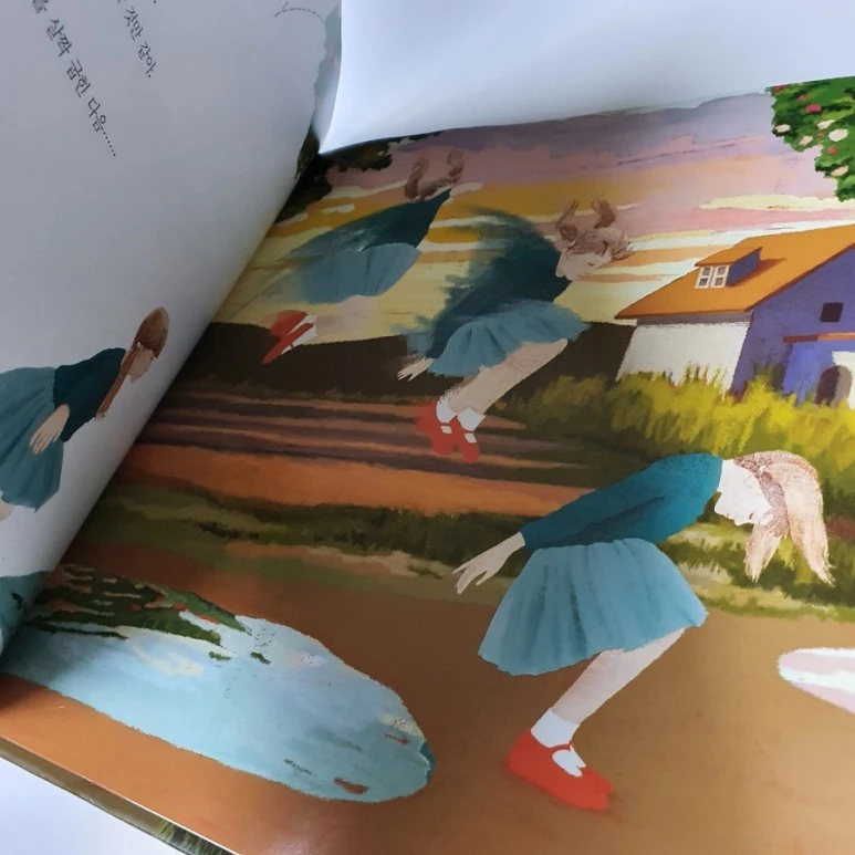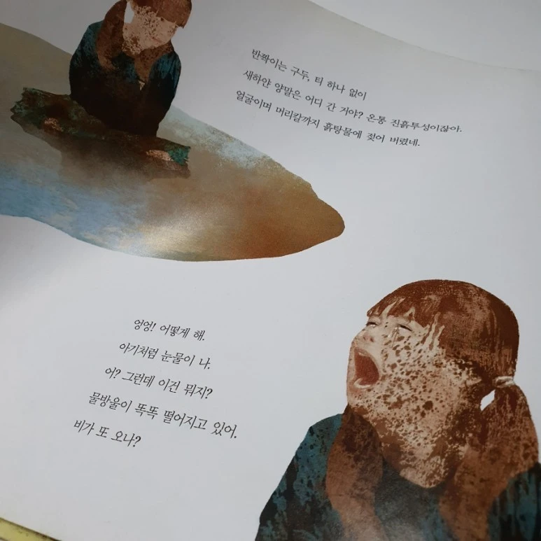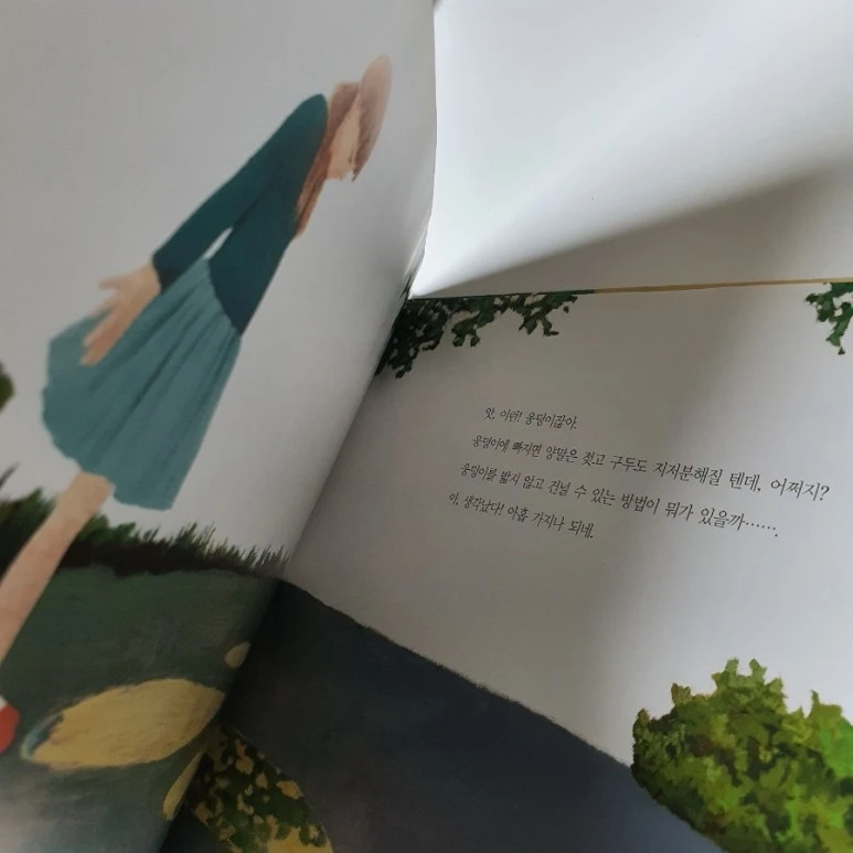 어머나 어느새 소녀는 웅덩이에 '풍덩'하고 말아요. 엉엉엉 울음이 나버립니다. 어쩌죠? 그런데 소녀는 이내 그 웅덩이를 첨벙첨벙 뛰어 오릅니다. 설마 포기한걸까요?