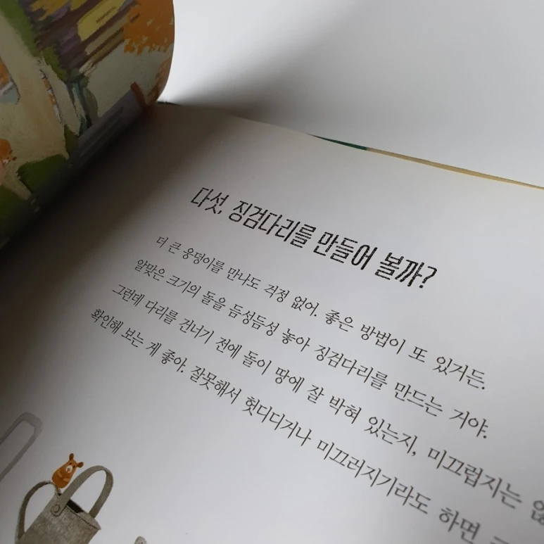 소녀는 폴짝 넘어간 후 자신감이 생겼나봐요. 더 큰 웅덩이를 만나도 걱정이 없다며 또 다른 방법을 제시하네요. 그건 바로 징검다리를 만드는 것이랍니다. 건널 수 없는 큰 웅덩이 곳곳에 돌을 놓아 그 돌을 건너면 되는거지요. 비록 돌을 고르고 옮겨서 웅덩이 사이사이 두어야 하는 문제는 있지만 큰 웅덩이를 건널수만 있다면 이정도쯤이야 감당이 되지 않을까요?
