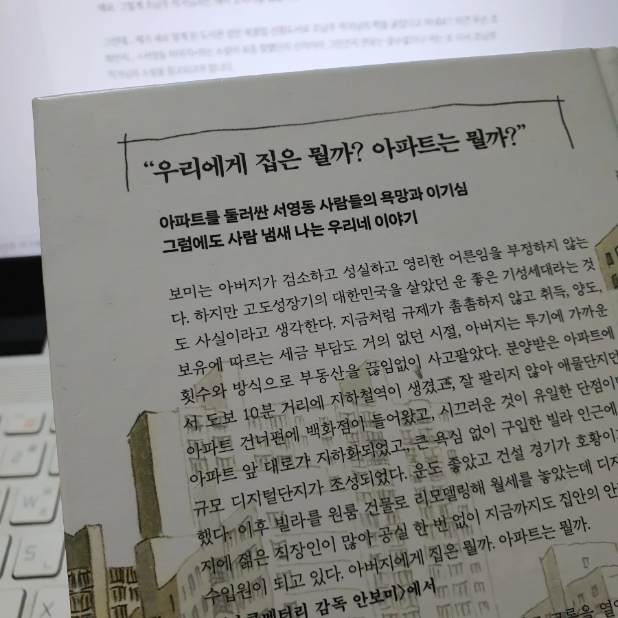 다행히 책 표지에서 느껴지는 초록 이미지가 상큼함을 불러 일으켜 도대체 무슨 내용인지 호기심을 안고 뒷면을 보니 '헉 이번엔 아파트?' '집이란 뭘까?'라니... 부동산이야기인가? 하며 책을 읽어 나가기 시작하는데 생각보다 꽤 재밌네요?!