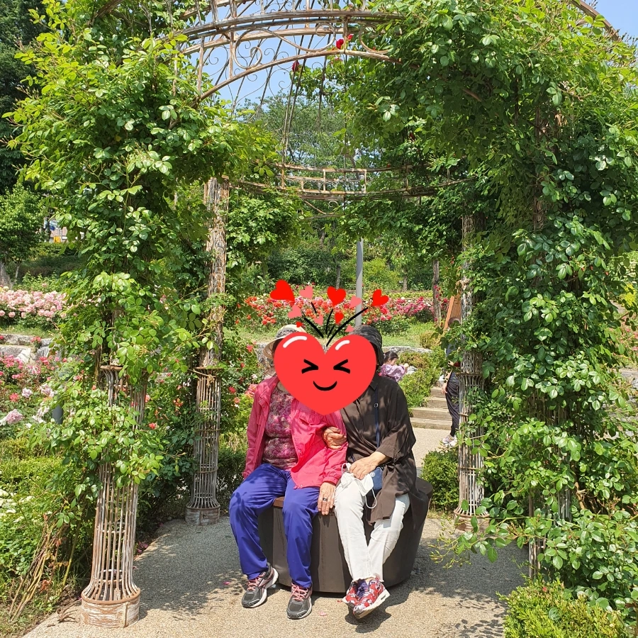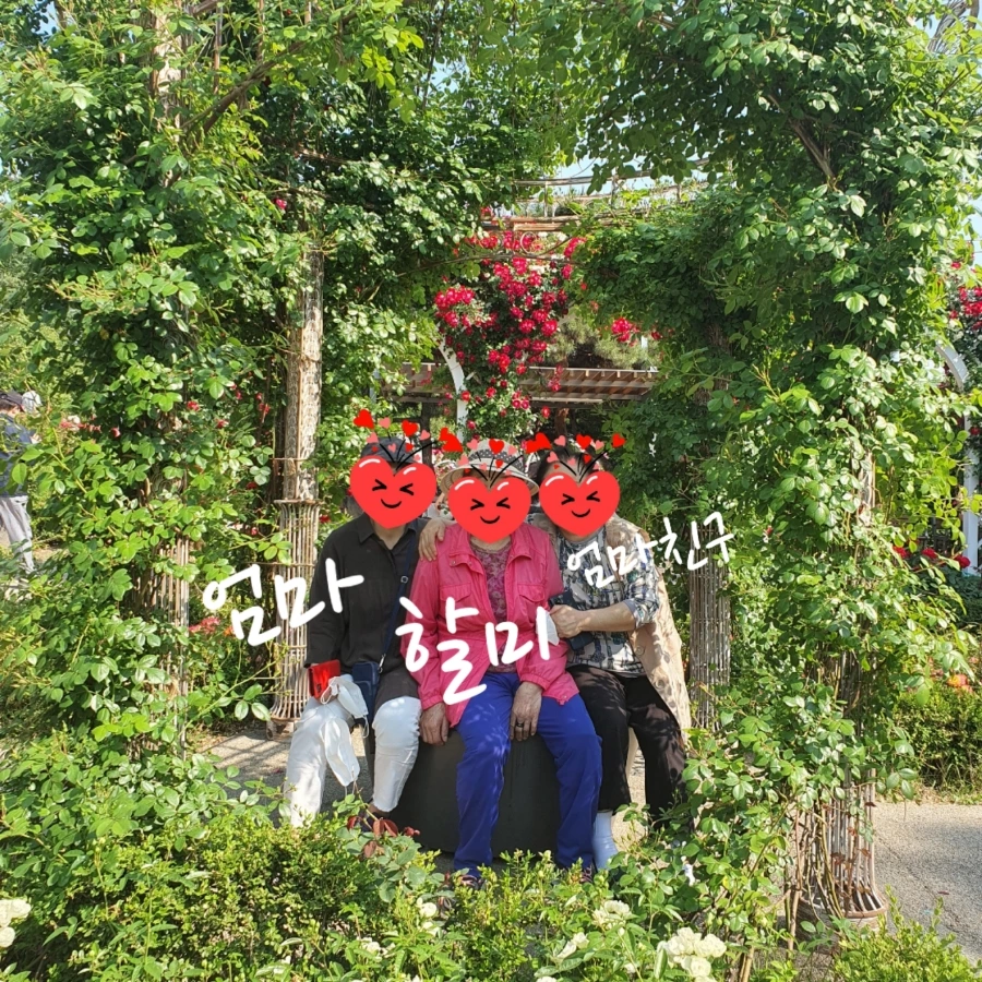 오늘 엄마의 용건은 저희 아파트 뒷편이 장미원이라 매년 이맘때 장미원에서 사진을 찍었는데 '장미원에 꽃 많이 폈지?' 하십니다. 집에서 푹 쉬고 싶었지만 엄마의 요청에 기꺼이 응해봅니다. 그렇게 엄마는 외할머니를 모시고 저희집 근처 장미원으로 오셨어요. 혼자 보기 아까우셨는지 근처에 사는 교회친구분도 불러서 같이 사진을 찍었답니다.
