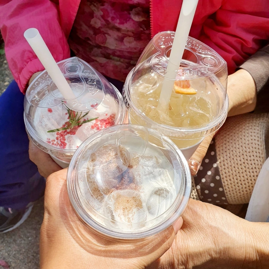 야외에 나왔으니 음료타임 해줘야지요. 장미원에 유일한 카페인 '응봉감성'에서 취향껏 음료를 테이크아웃 합니다. 엄마는 굳이 음료를 뭐하러 먹으면서 돈을 쓰냐고 하시지만 돈은 이럴때 쓰라고 있는거죠. 젊은 감성 느껴보시라고 음료 모아서 사진도 찍어봅니다.