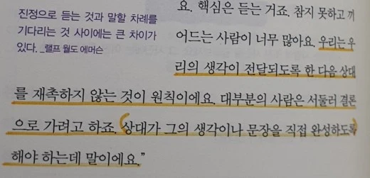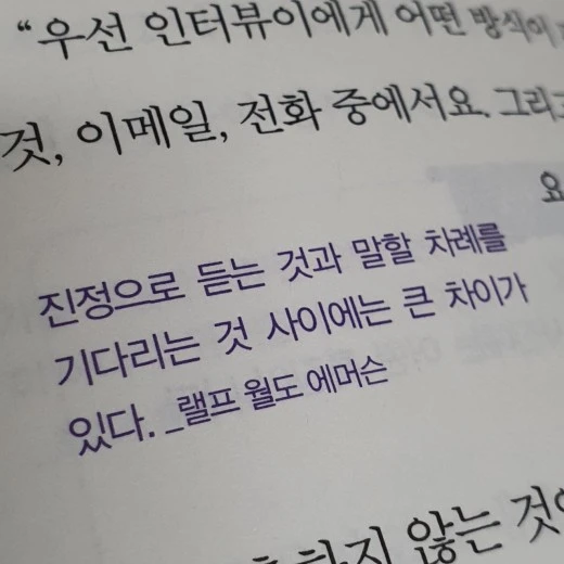 이 책을 보고 대화 중 진정한 듣기에 대한 생각이 깊어졌답니다. 여전히 상대의 이야기를 들으면서도 다음에 내가 무슨 말을 할까? 어떤 말을 해줘야 할까? 라는 생각을 품고 상대의 대화를 귀로만 들은거죠. 저의 가장 큰 장점이 아는 것을 실천하는 것이라고 했었죠? 저는 바로 듣기를 실천했답니다. 온 마음과 열린 귀로 상대의 이야기를 듣기 시작한거죠. 굳이 내가 어떤 말을 할까 고민하지 않아도 자연스럽게 상대의 말이 끝난 후 제 할말이 떠오르더군요.