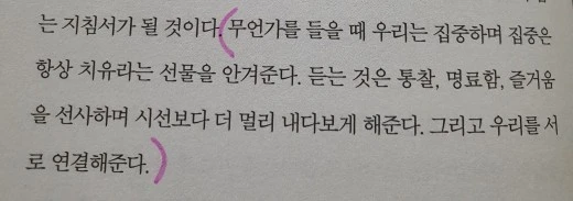 우리는 관계안에 있으면서도 스스로만 생각하는 순간이 너무도 많아요. 대화를 하는 거 만으로도 충분히 그렇잖아요. 진정한 관계라는 건 서로의 마음이 오고가는데 막힘이 없어야 할거 같아요. 그런면에서 상대의 이야기를 충분히 들어주는 건 그 마음이 오고가는 것에 큰 작용을 할듯 합니다. 온 마음으로 누군가의 이야기를 들어주는 건 상대를 기쁘게도 하지만 스스로 마음이 충만해진다는 걸 느끼실거에요.