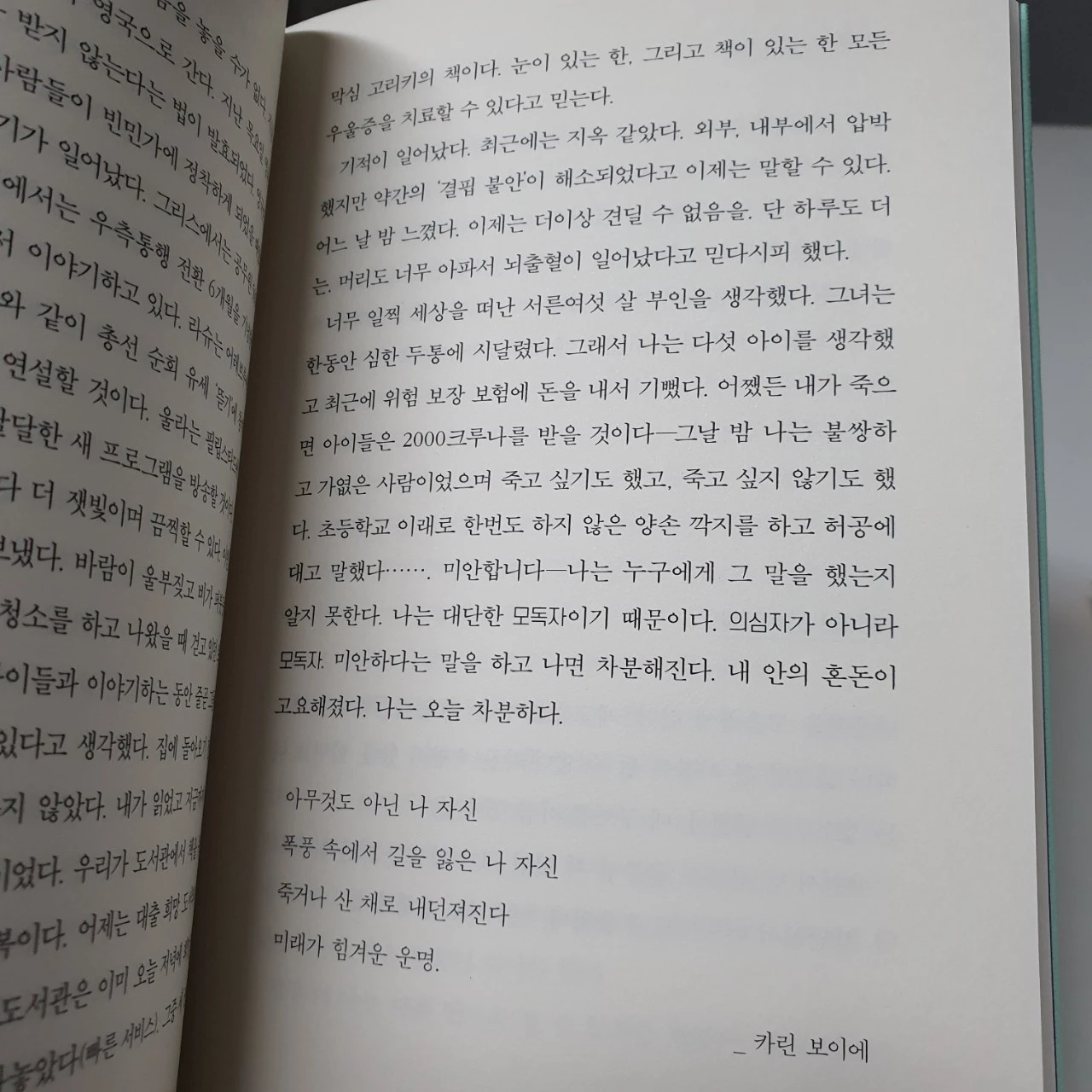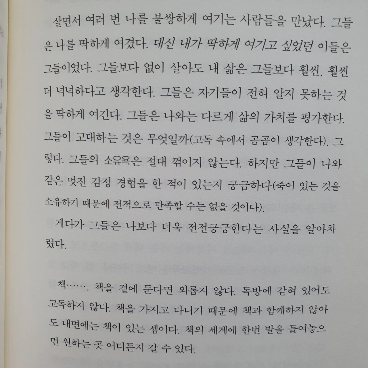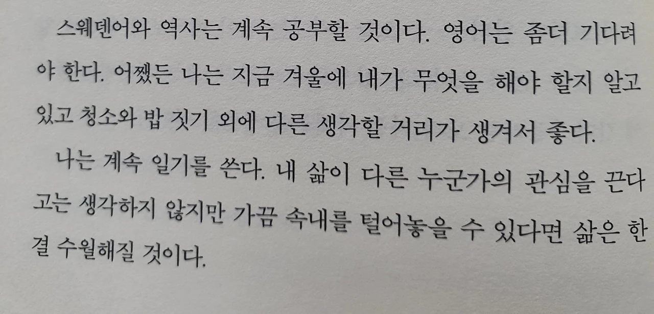 가난이라는 것은 빛나는 해를 보면서도 빛남을 느끼지 못하게 합니다. 가난의 그늘은 주변이 드리우지 않아도 스스로 짐지고 있으니 말입니다. 그녀는 책에서 가난을 자주 언급하지만 독자로 하여금 가난이라 읽히기 보다는 조금 모자란 풍요로 읽히기도 합니다. 그늘진 가난에 짓눌러 있는 듯 하지만 그녀의 삶의 대한 사색과 세계 정세를 바라보는 시선에는 물질의 풍요를 누리는 자 이상의 것이었으니 말입니다.