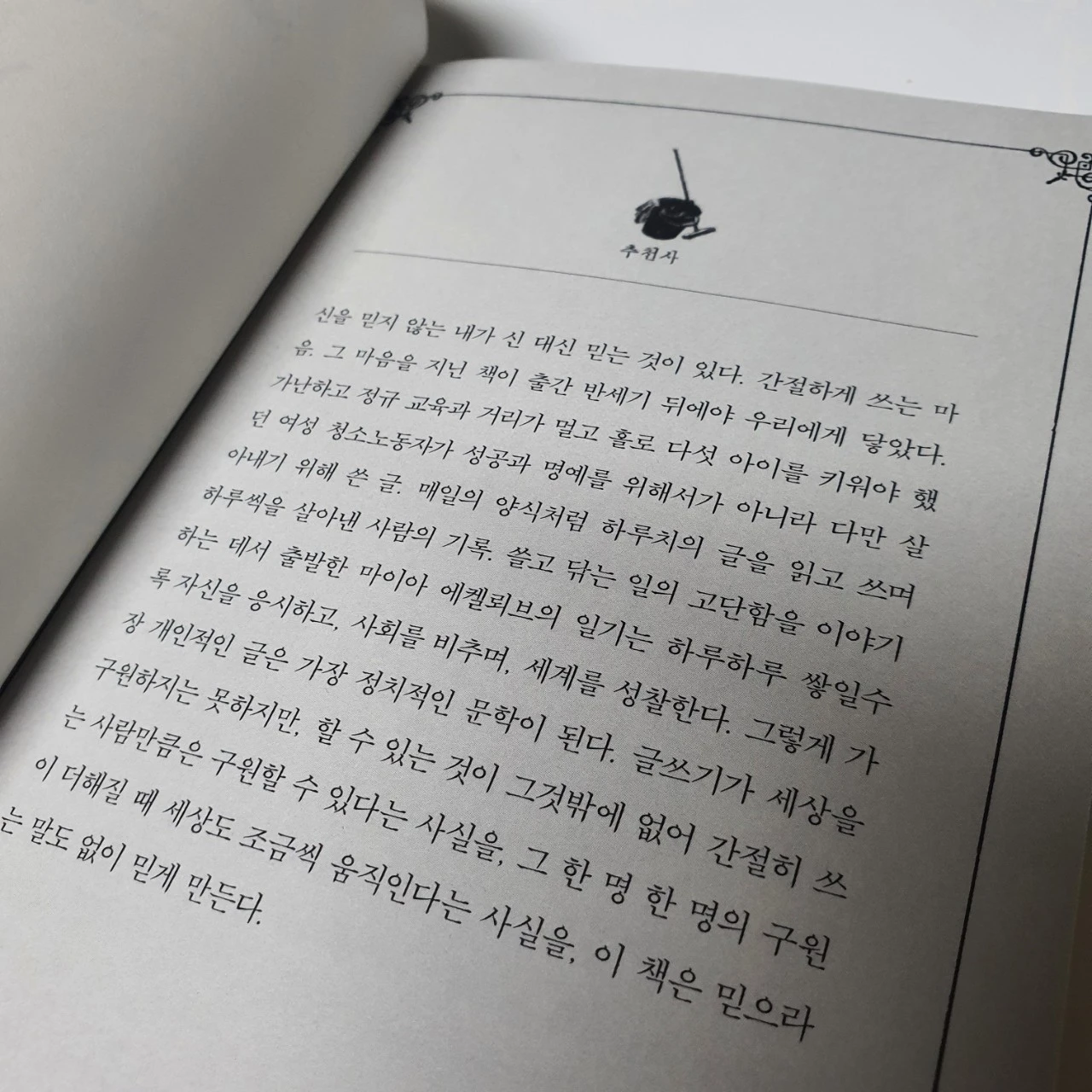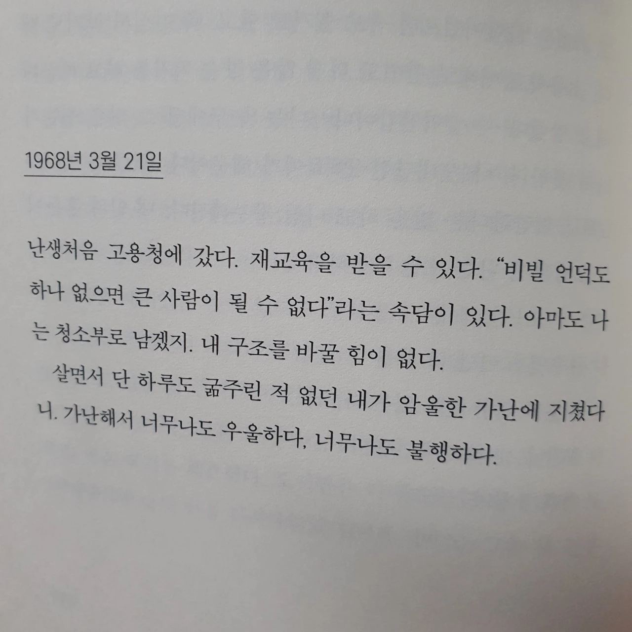 청소 노동자로 살아가는 그녀에게 자기의 길을 밝혀줄 불빛은 글쓰기였습니다. 그녀의 상황이나 그 당시 세계 정세에 대한 부분을 담담한 어조로 써내려 나갑니다. 오히려 담담해서 더 가슴 아프게 다가오는 문장도 많았습니다. 담담한 어조가 가능한 것은 이미 통달을 했다는 의미일까요? 퍽퍽하기 그지없고 빛보다는 어둠에 익숙한 현실이지만 그럼에도 불구하고 자신의 빛줄기인 공부와 책 그리고 글쓰기를 통해 그녀의 빛을 잃지 않습니다. 굴욕의 순간마다 자신을 지킬 수 있었던 힘을 스스로 기르고 있었던 것이지요.