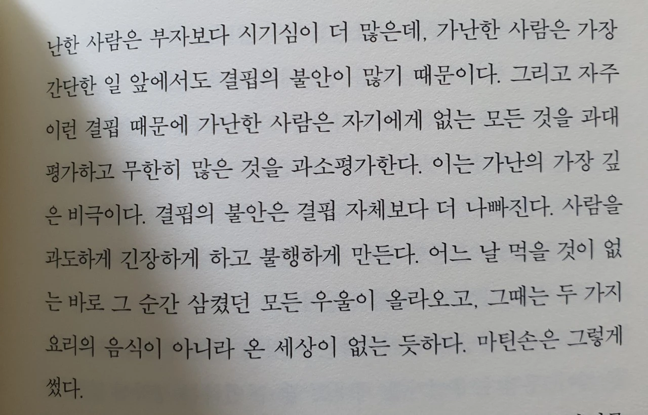 가난은 보통의 껍질 속이 아닌 보통의 껍질 밖에서 보통 속에 있는 것들을 부러워 하게 만듭니다. 보통의 껍질 속에 있는 자들은 보통의 껍질을 벗어난 상태에 대해서 알지 못합니다. 그저 자신의 보통의 껍질을 더 단단하게 만들 뿐이지요. 어쩌면 그녀는 보통의 껍질속에 있고 싶었을지도 모르겠단 생각이 듭니다.