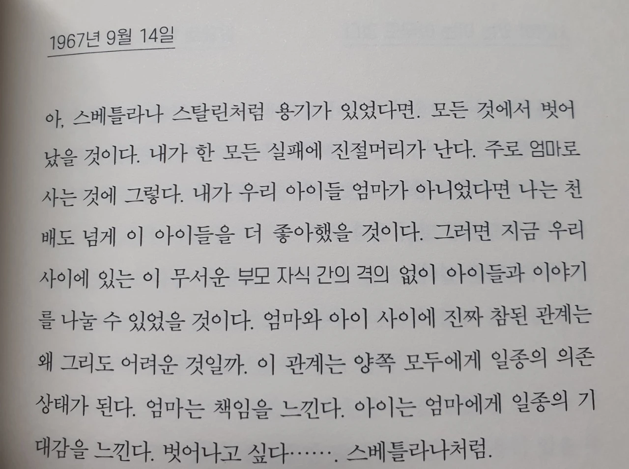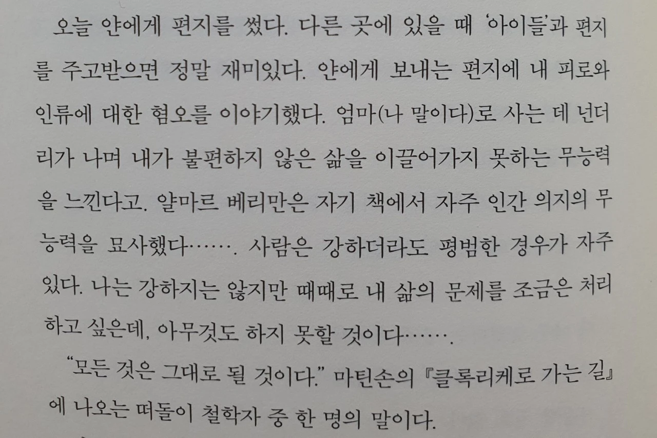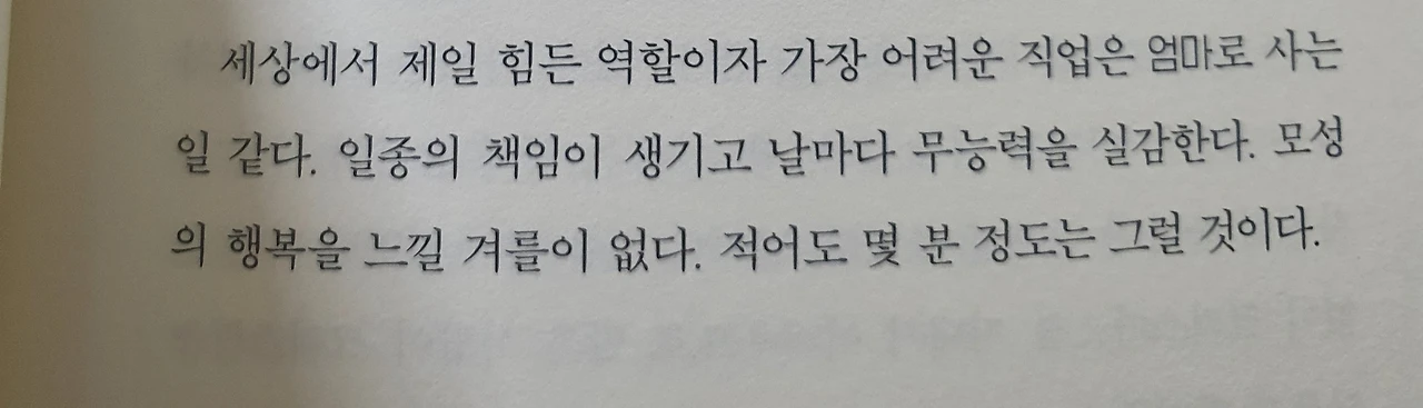 아이들과 격이 없이 대화를 나누기 이전 먹고 살 것이 걱정인 그녀는 그점이 아쉽기만 합니다. 엄마로서 기댈 수 있는 구석이 되어주고 싶지만 그녀조차도 그저 글에 기대어 살아가는 것으로 스스로를 아슬하게 지탱하고 있으니 말입니다. 그녀의 문장은 곱씹을수록 아프고 아픕니다.