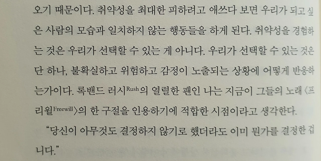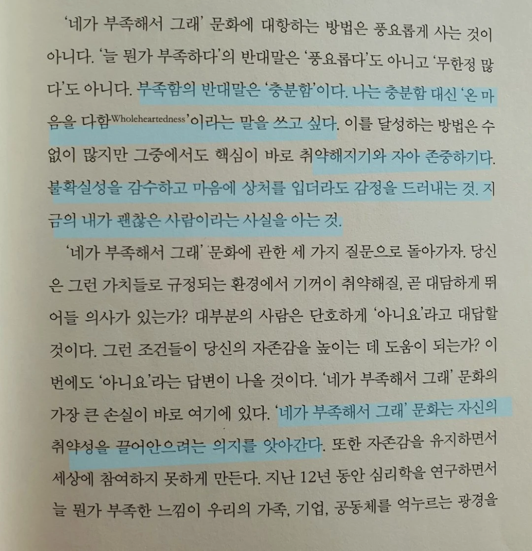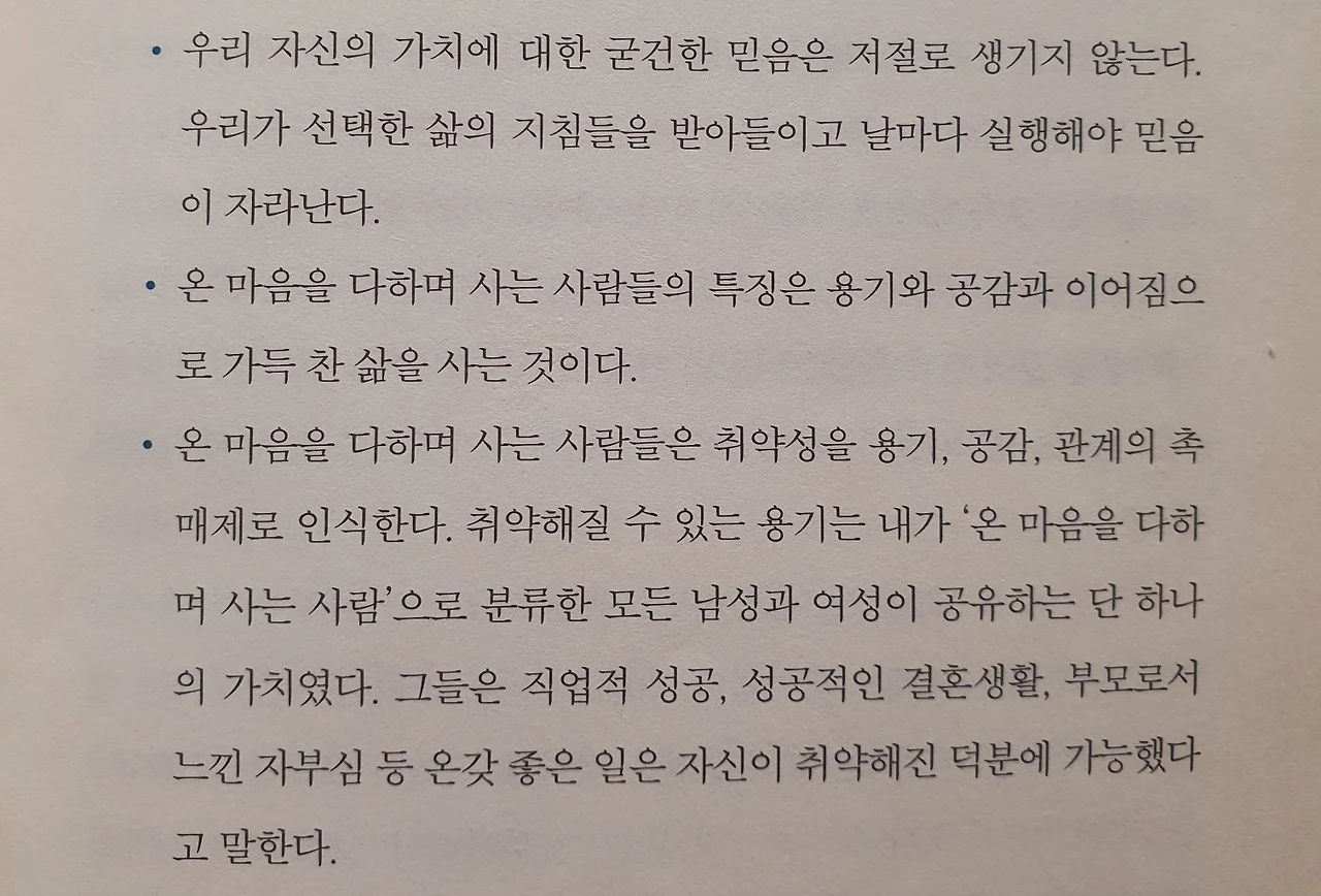 우리 스스로에 대한 긍지와 자신감을 잃지만 않는다면 우리는 온 마음을 다해 자신만의 삶을 충분히 살아내 갈 수 있음을 믿습니다. 그러기 위해서는 자신의 취약성에 대한 두려움을 호기심으로 바라보고 그 호기심에 대한 결론으로서 취약성에 대한 용기를 내면 됩니다.