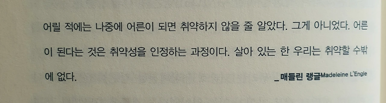 아마도 우리가 스스로의 취약성을 더 키우는 원인이 자신을 그대로 인정하고 받아들이지 못하기 때문이 아닐까요? 나는 잘나고 나는 대단한 사람이고 싶은데 그러지 못하다는 걸 이미 스스로 알고 있으니 자꾸만 외면하는 것입니다. 외면하면 나는 그렇지 않다고 여기며 스스로를 속이는 것인데 말이지요. 반면에 그것을 자신의 나약함이나 못남으로 해석하고 나는 부족해, 나는 못났어, 나는 뭘 해도 안돼 라며 자기암시를 거는 사람도 있을 거고요. 전 제 취약성이나 부족함을 마주하지 않고 외면함으로써 인정하지 않은 쪽에 가깝네요.