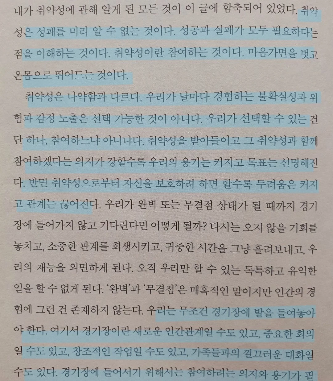 저 역시 그녀의 취약성에 대한 이야기를 통해 제 취약성이 무엇인지 그 취약성에 내가 매몰되어 내 인생의 넘지 못하거나 넘지 않은 허들이 많았구나 했습니다. 그 허들은 넘지 않는다고 없어지지 않습니다. 내가 넘어서지 않는 이상 언제나 내 인생 어느 순간에도 마주할 허들인 것입니다. 그 허들을 넘지 않고는 나를 뛰어넘지 못하기 때문이지요.