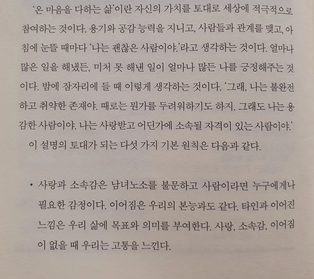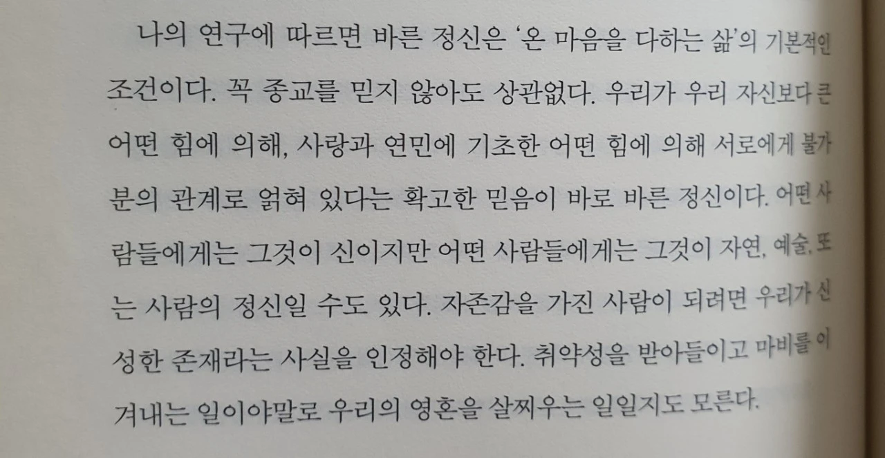 이것이 온 마음을 다하는 삶의 부분이었을까요? 사실 오늘 하루 종일 아이들에게 잔소리를 달고 싶었는데 그 잔소리마저도 제 마음의 찌꺼기라는 것을 저 스스로 자각했기에 그저 현실에 주어진 내 임무를 잠잠히 행하는 것으로 저 스스로를 자제시킨 것이었죠. 제 취약성을 알기에 그 취약성이 불거지는 것에 대한 신호를 저 스스로 감지하고 취약성에 빠져들지 않기 위해 용기를 낸 것입니다. 그렇게 오늘 하루도 어른으로서 제 삶을 온 마음을 다해 몸과 마음으로 일구어내려 애를 썼답니다. 이렇게 서평을 쓰면서 다시 한번 되새김이 되고 다짐이 되니 참 감사하네요.