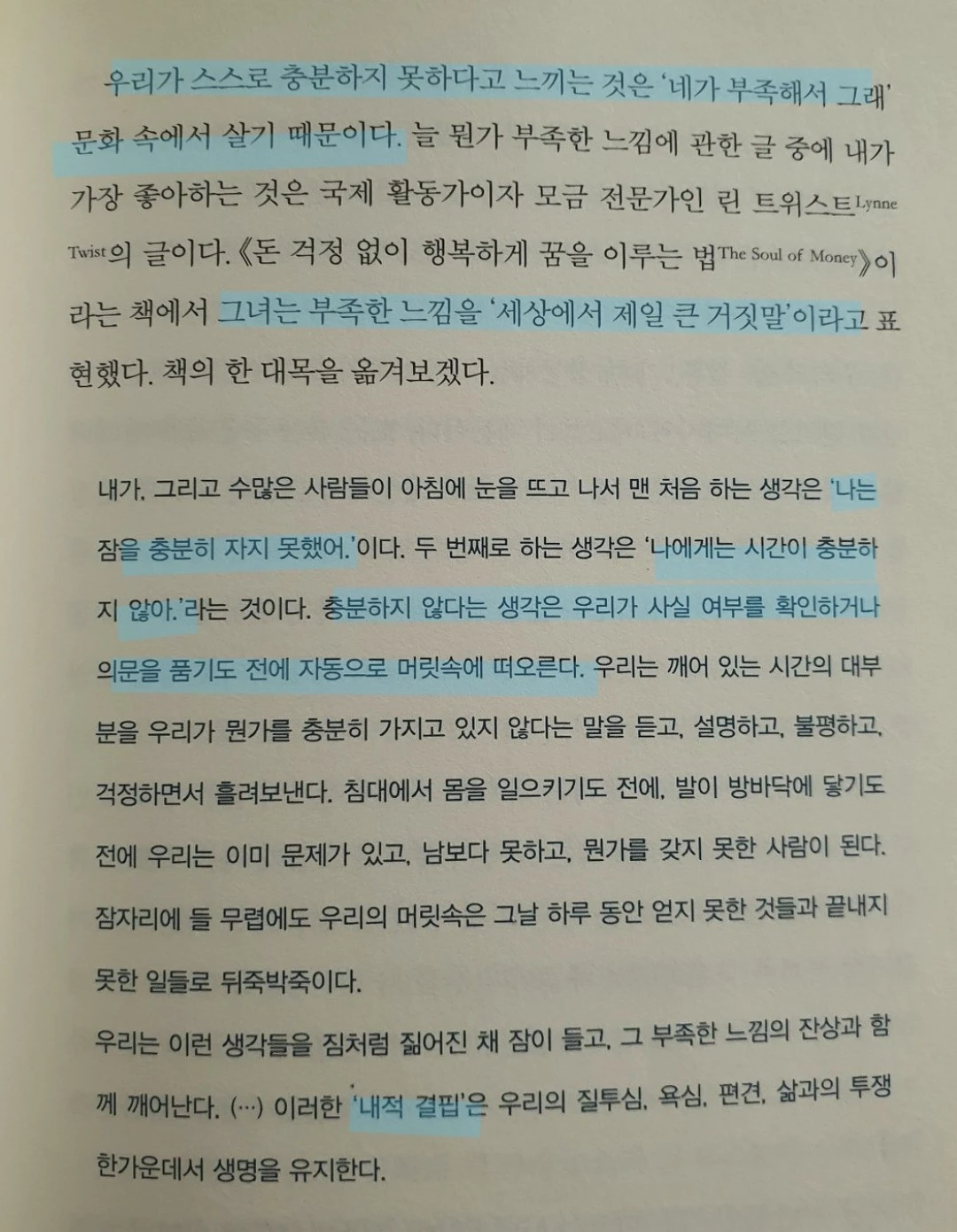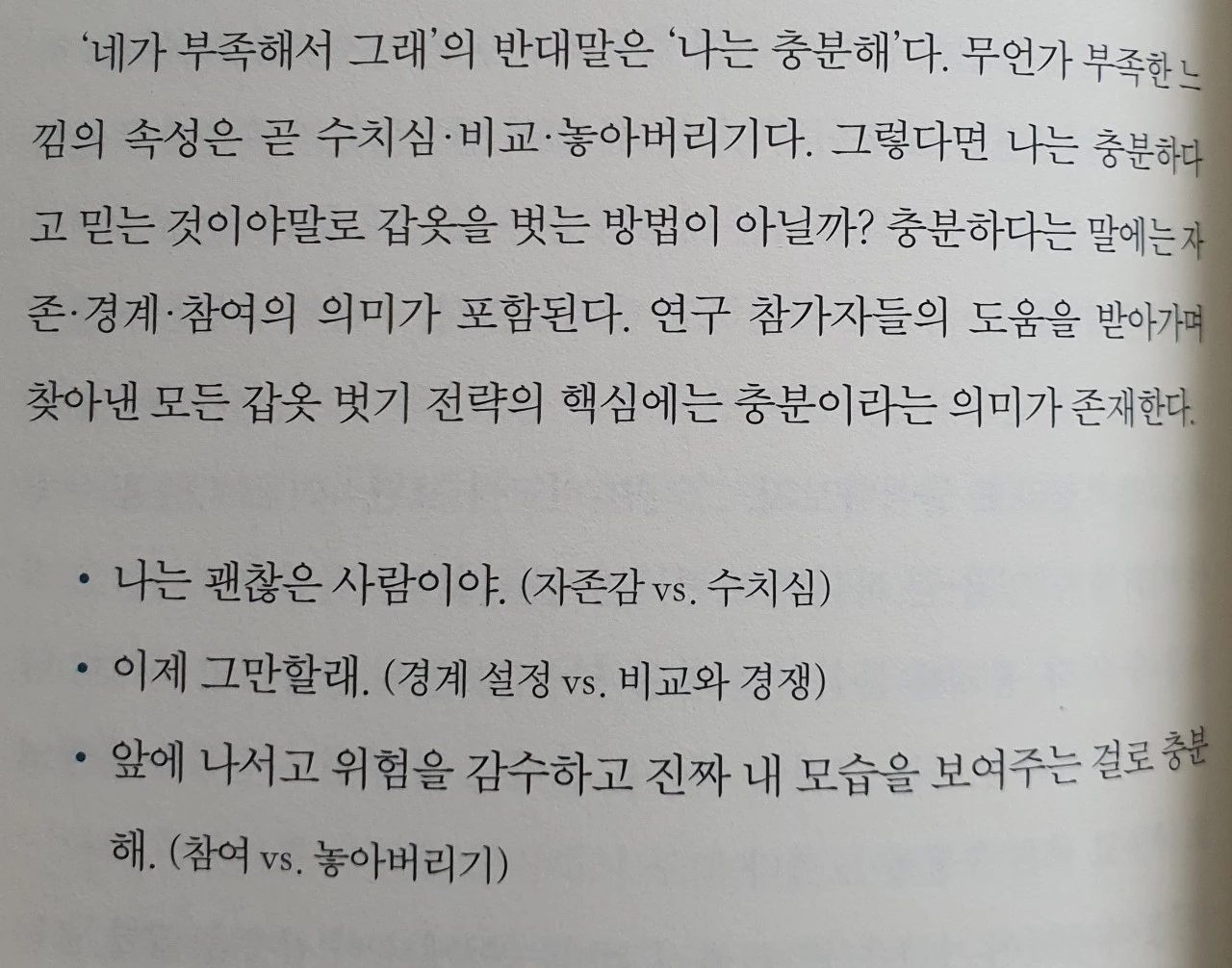 그리고 사실 내가 부족하다 느끼는 것이지 그게 진짜 부족한지는 아무도 모를 일 아닐까요? 그냥 내가 채우고 싶은 부분에 부족함을 느끼는구나를 안다면 부족한 느낌으로 인해 파생되는 감정에 함몰되진 않을 듯합니다. 저 역시 어른으로 살아가는 지금도 부족한 거 같고 뭔가 채워야 할 거 같은 사실보다는 그로 인해 파생되는 감정이 더 힘들답니다.