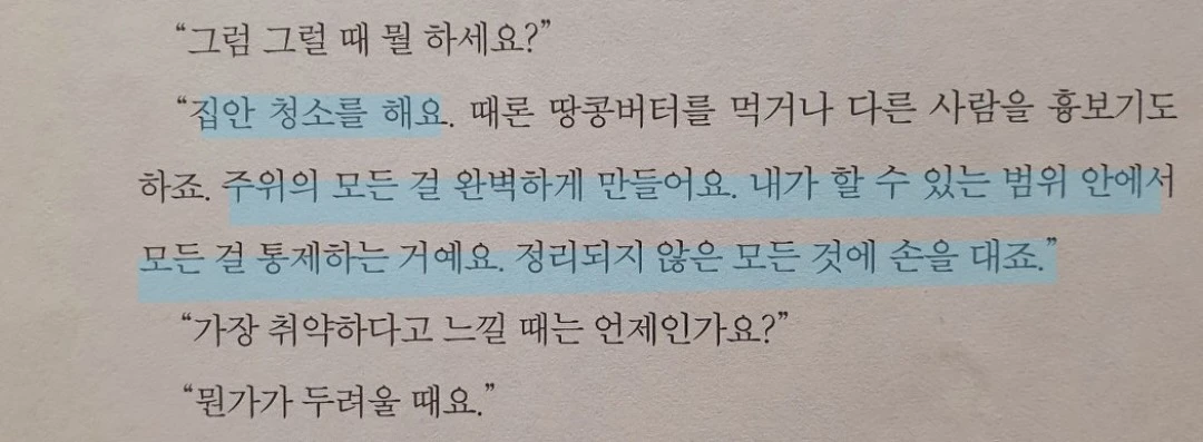 제가 브레네 브라운에 빠져들게 된 이유 중 하나는 저와 너무 비슷한 그녀이기 때문입니다. 이 대화를 보면서 나도 알지 못했던 내가 대화를 하는 줄 알았습니다. 저 역시 인생의 전반적인 부분이 정돈되지 못하면 당장 눈앞에 보이는 것부터 정리하며 완벽하게 만들어 냅니다. 내면에 얽히고설킨 것들을 보이는 생활적인 면에서 완벽을 추구하며 대리만족을 한다고 할까요? 이것도 취약성이 될 수 있지만 저는 제가 그럴 때 내 마음이 정리가 안되는 무엇으로 심란하구나를 할게 되었으니 취약성을 알고 극복했다고 할까요? 지금 정리의 몫은 내면의 청소를 넘어 실생활에 도움이 되는 패턴으로 안정적이게 자리 잡았답니다.