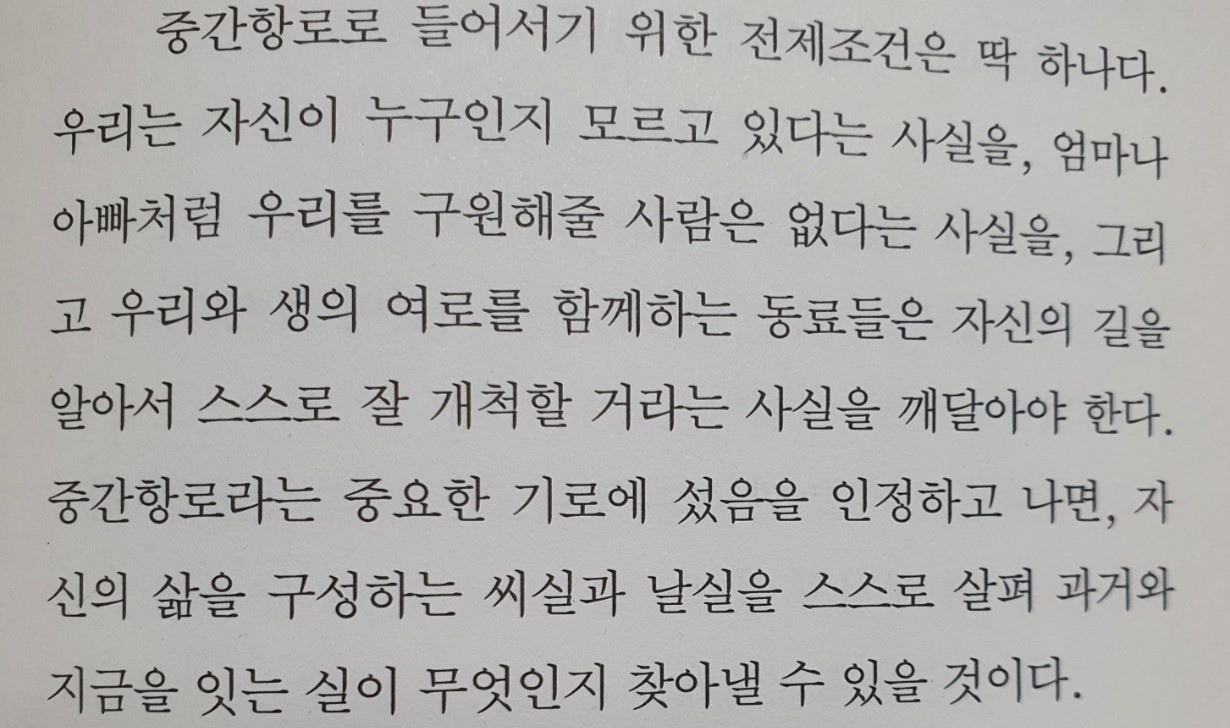 비록 그러기 위해서는 견뎌야 하는 통로가 있다. 지나온 세월에 대해 곱씹어 보기도 해야 하고 그 세월에 대한 충분한 애도도 필요할 것이다. 주어진 조건과 할당된 나로 살아왔다 해도 결국 내 삶을 산 것이기에 삶을 나 스스로 애도하고 어루만져 줘야 한다. 그래야지만 나로서 앞으로 나아갈 힘을 얻게 되는 것이다.